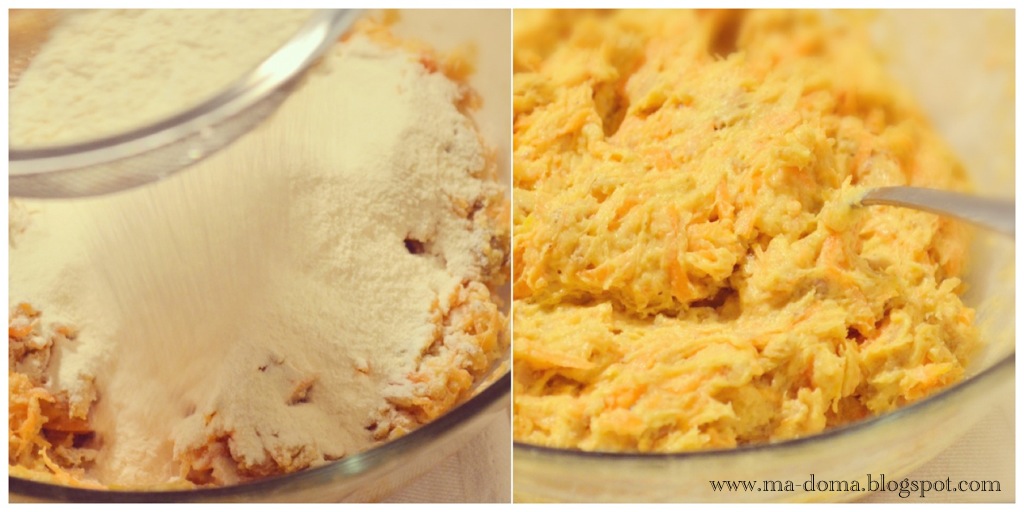 Далее добавьте просеянную муку и разрыхлитель. Все хорошо перемешайте.