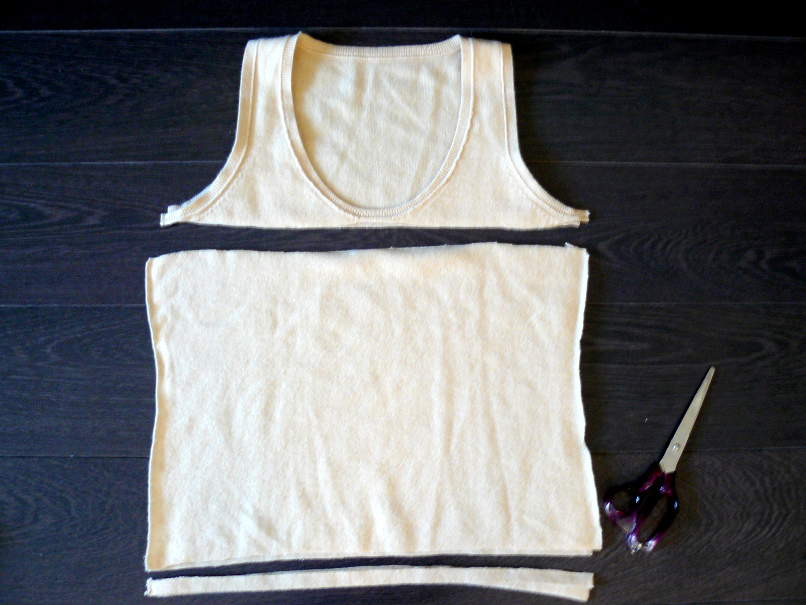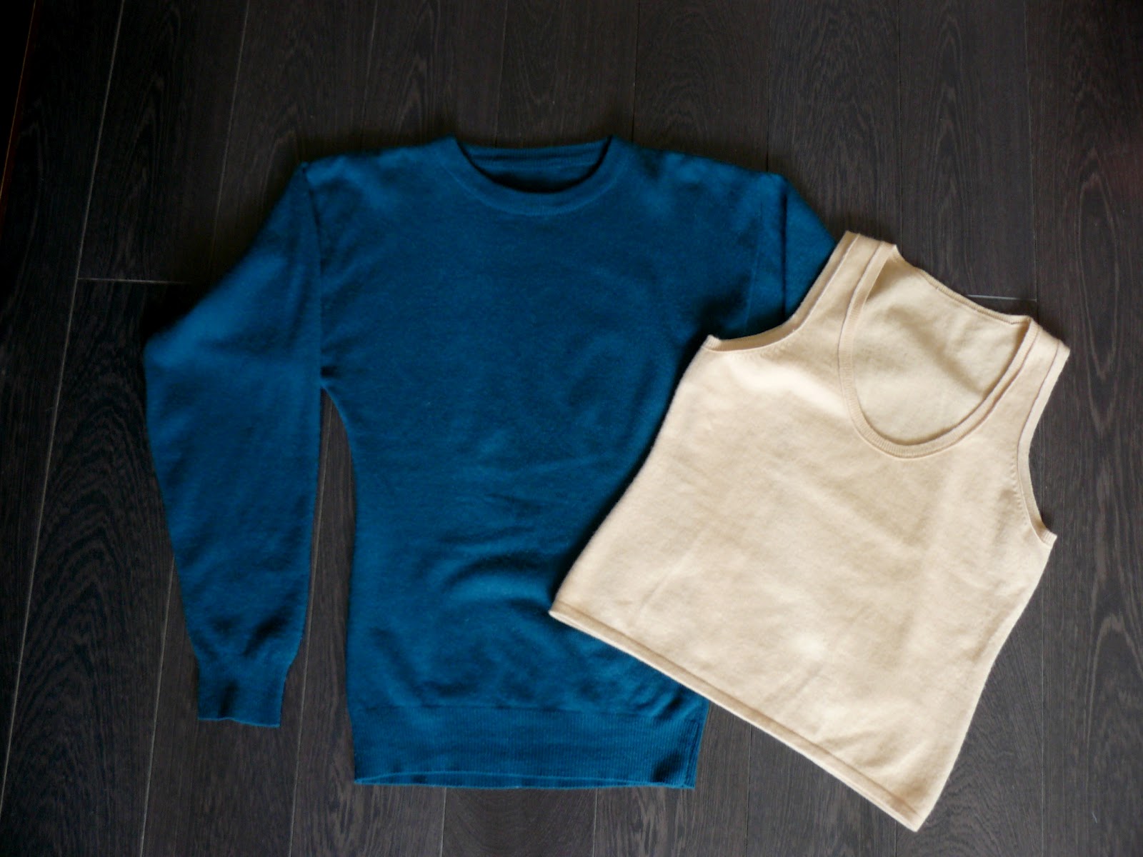 Итак, берем два любых свитера, лучше одинаковой фактуры вязки - будет легче сшить, и швы будут аккуратнее. В моем случае, это кашемировый свитер и майка.