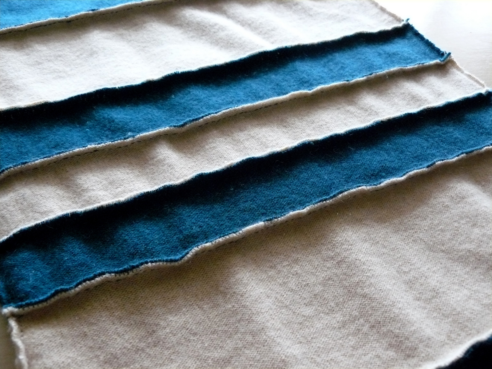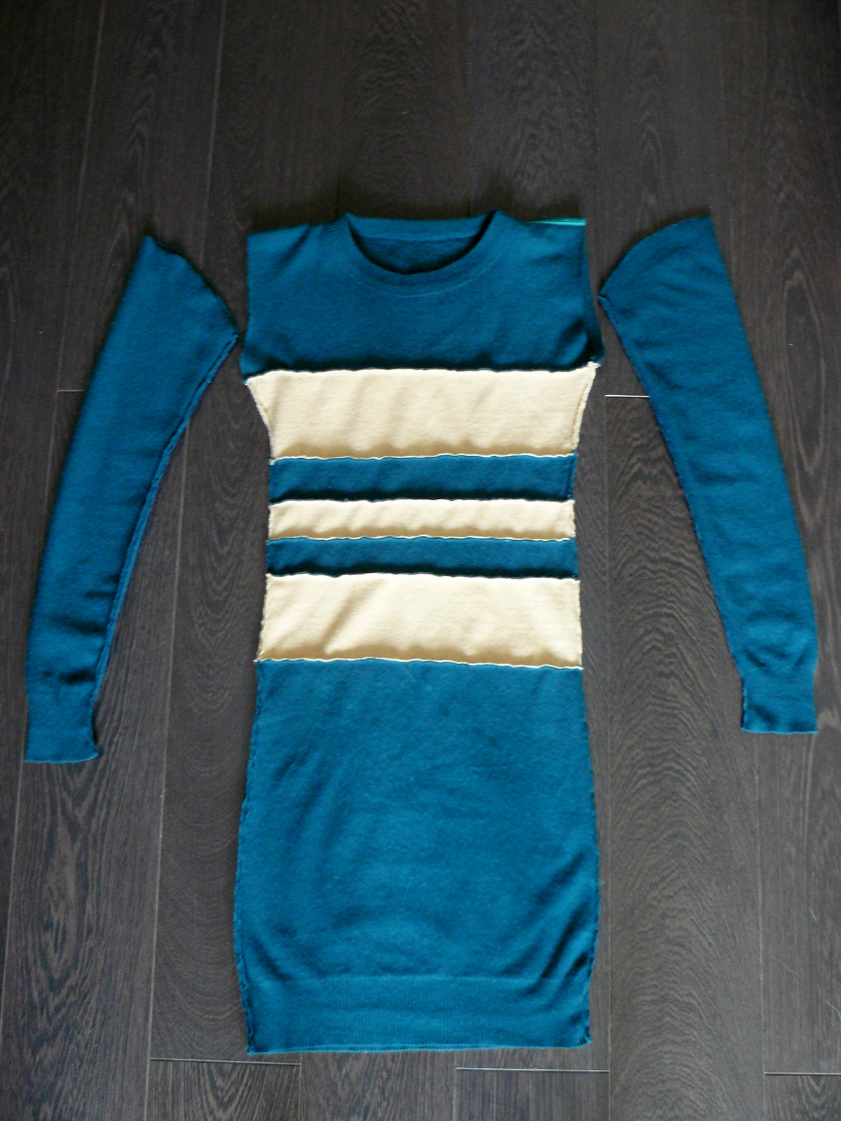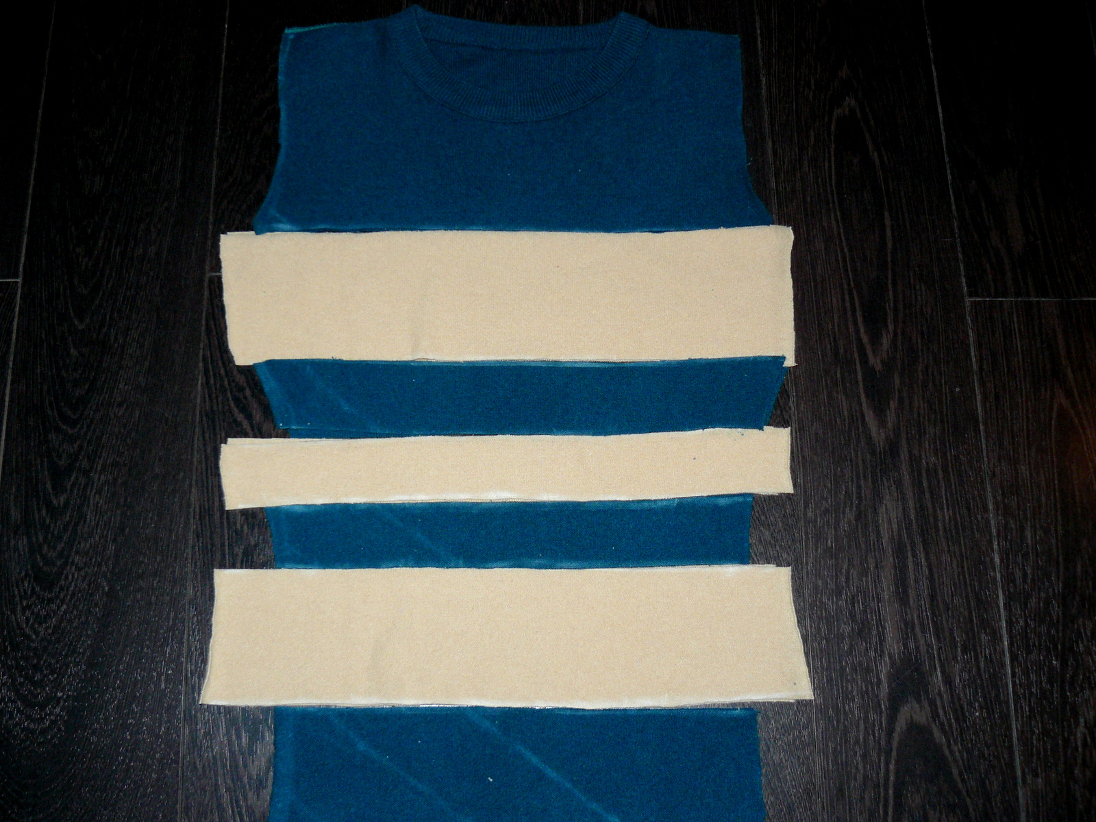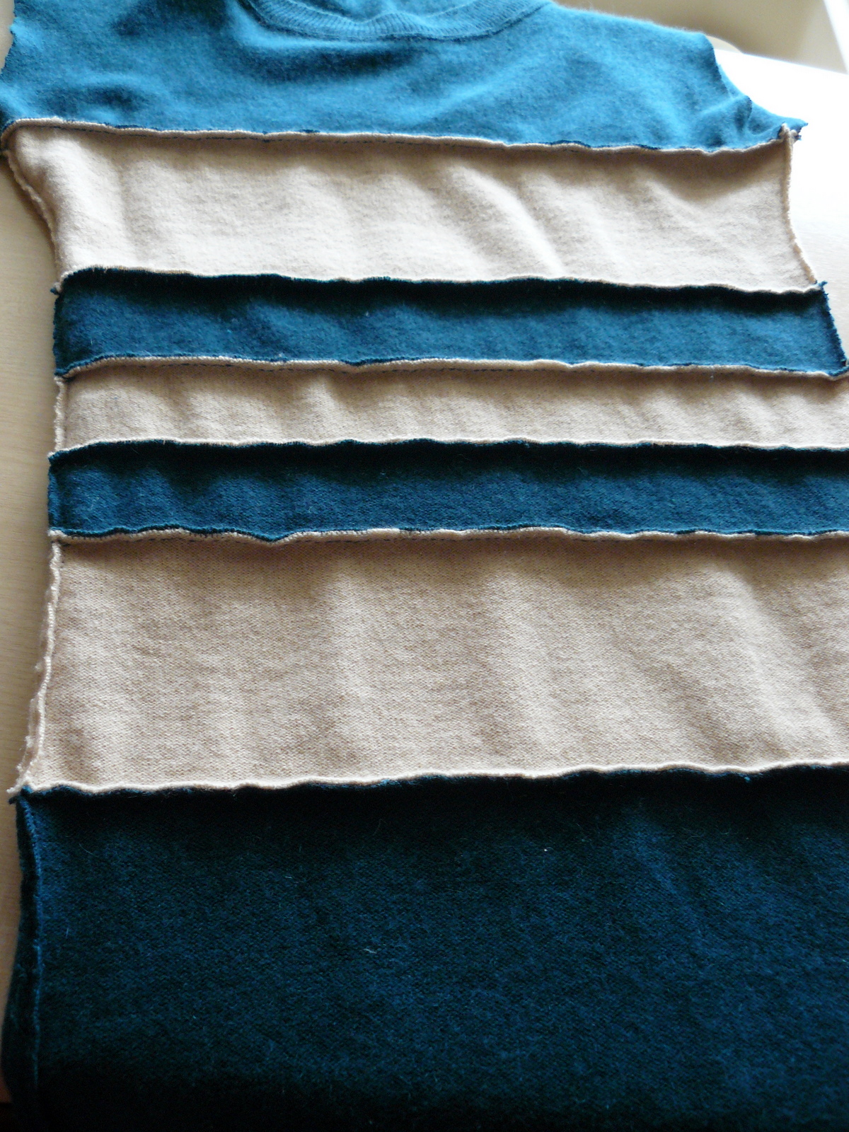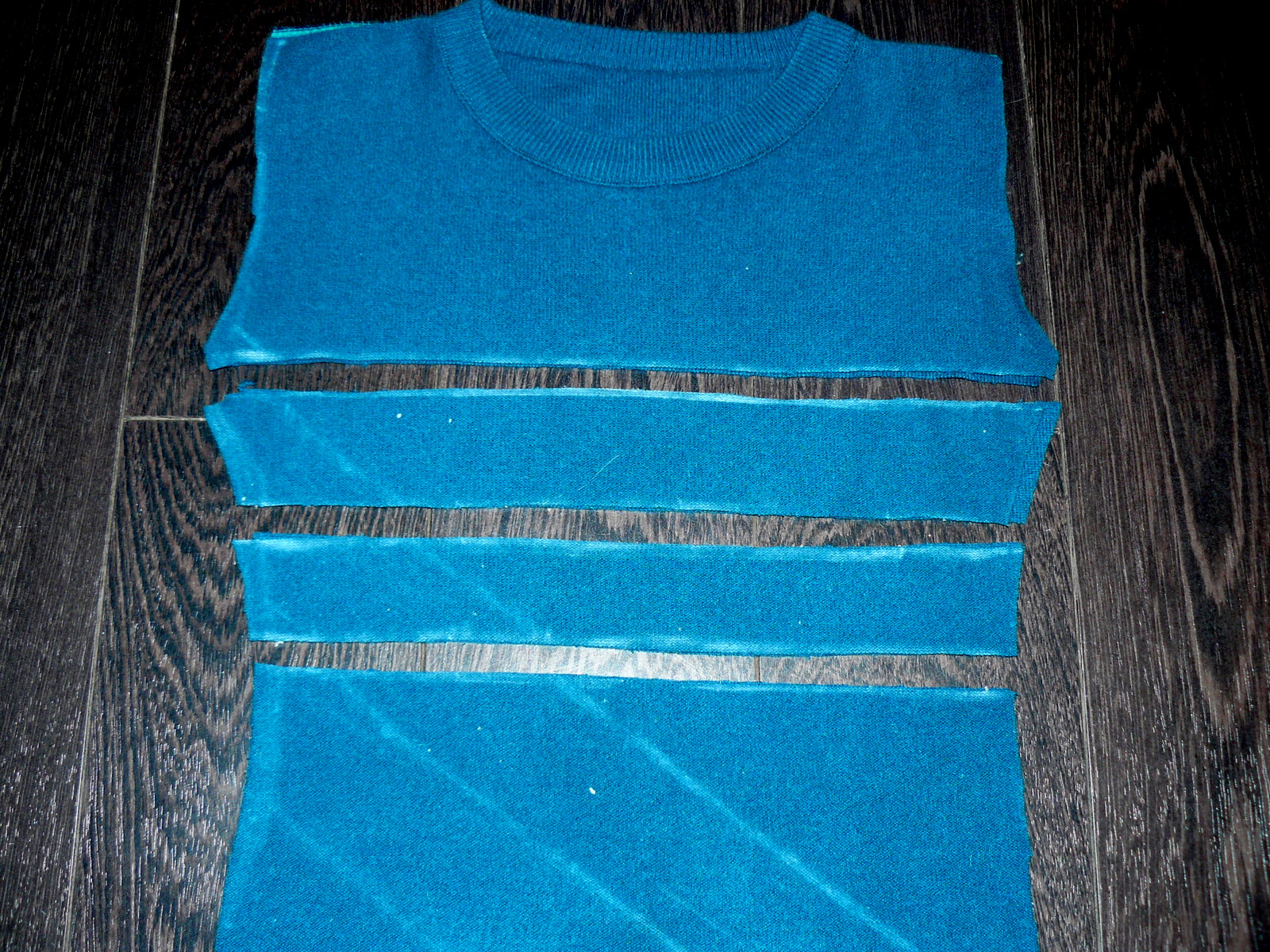 Дальше все зависит от фантазии. Разрезать свитер можно по диагонали, горизонтали, вертикали... Вообщем как угодно. Я вот сначала думала сделать диагональные вставки, потом передумала :) Сложно вручную сшить ровные диагональные швы.