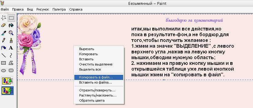 ...можно на этом и завершить процесс создания авторского бордюра , все зависит от Вашей фантазии и задумки...не сложно,например,фон сделать не белым,а цветным,воспользовавшись инструментом "ПИПЕТКА"(Выбор цвета)...для этого ,нажав на него левой кнопкой мышки , затем переходите на рисунок ,подбираете нужный оттенок.