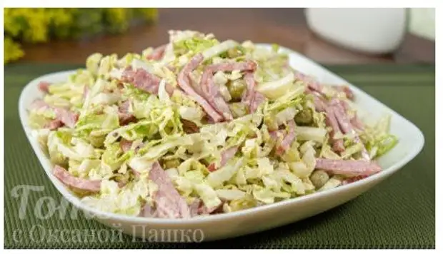 В большую миску кладем нашинкованную капусту, нарезанную колбасу и банку консервированного горошка.