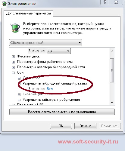 Находим вкладку сон, выключаем опцию разрешить гибридный спящий режим, нажимаем применить и ок.