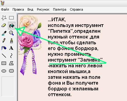 ...можно на этом и завершить процесс создания авторского бордюра , все зависит от Вашей фантазии и задумки...не сложно,например,фон сделать не белым,а цветным,воспользовавшись инструментом "ПИПЕТКА"(Выбор цвета)...для этого ,нажав на него левой кнопкой мышки , затем переходите на рисунок ,подбираете нужный оттенок.