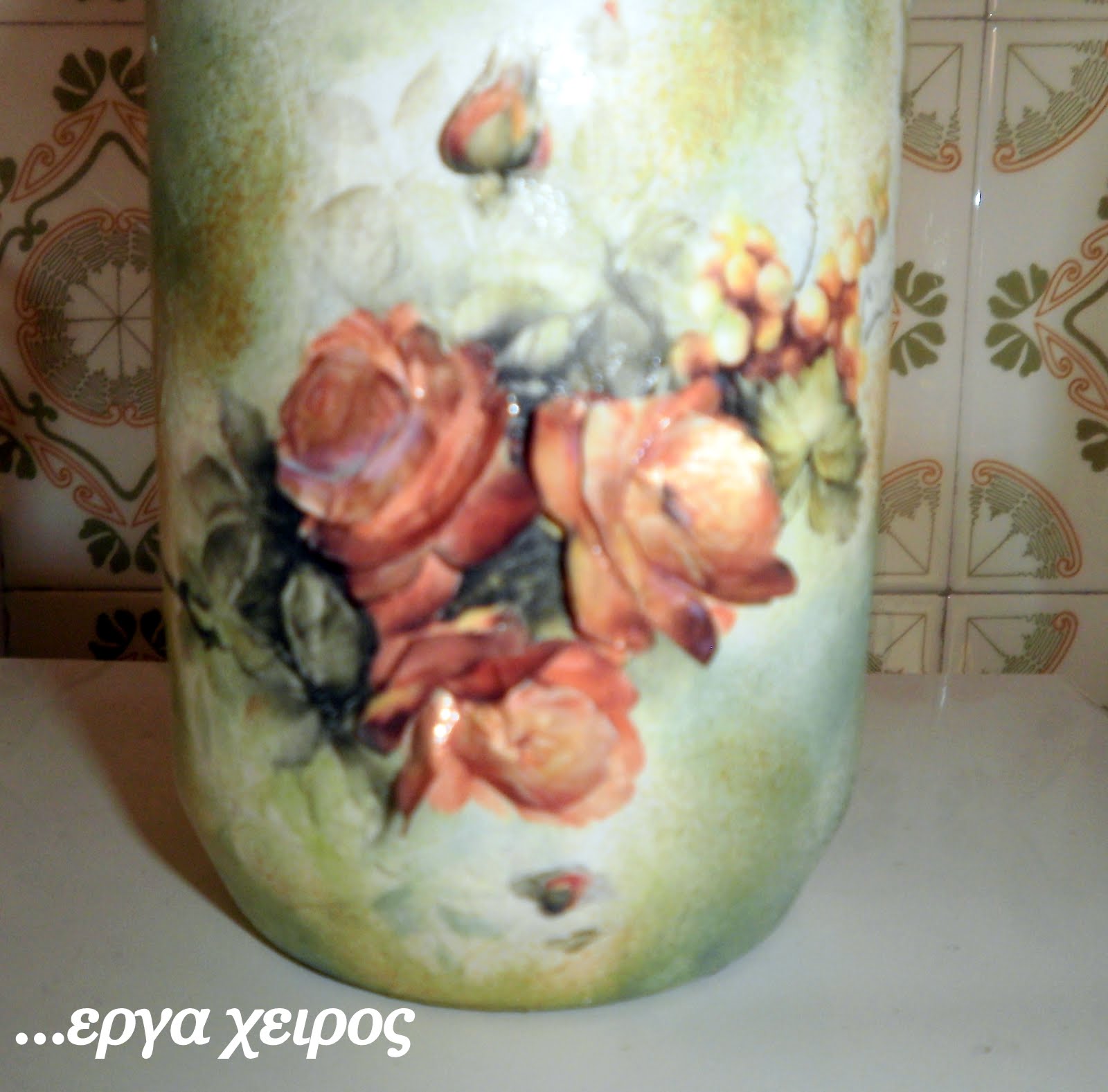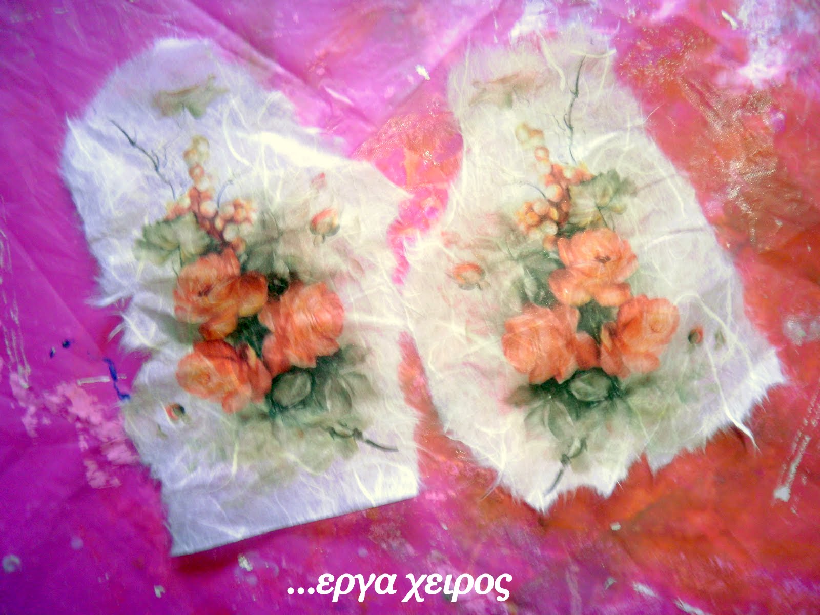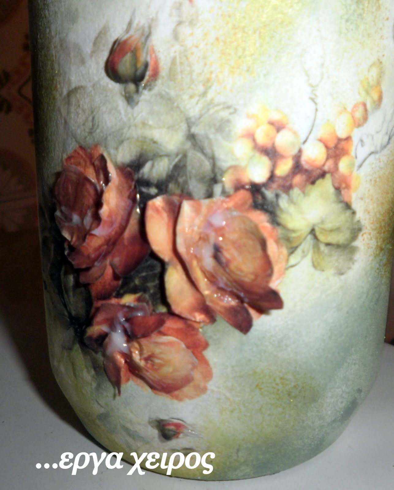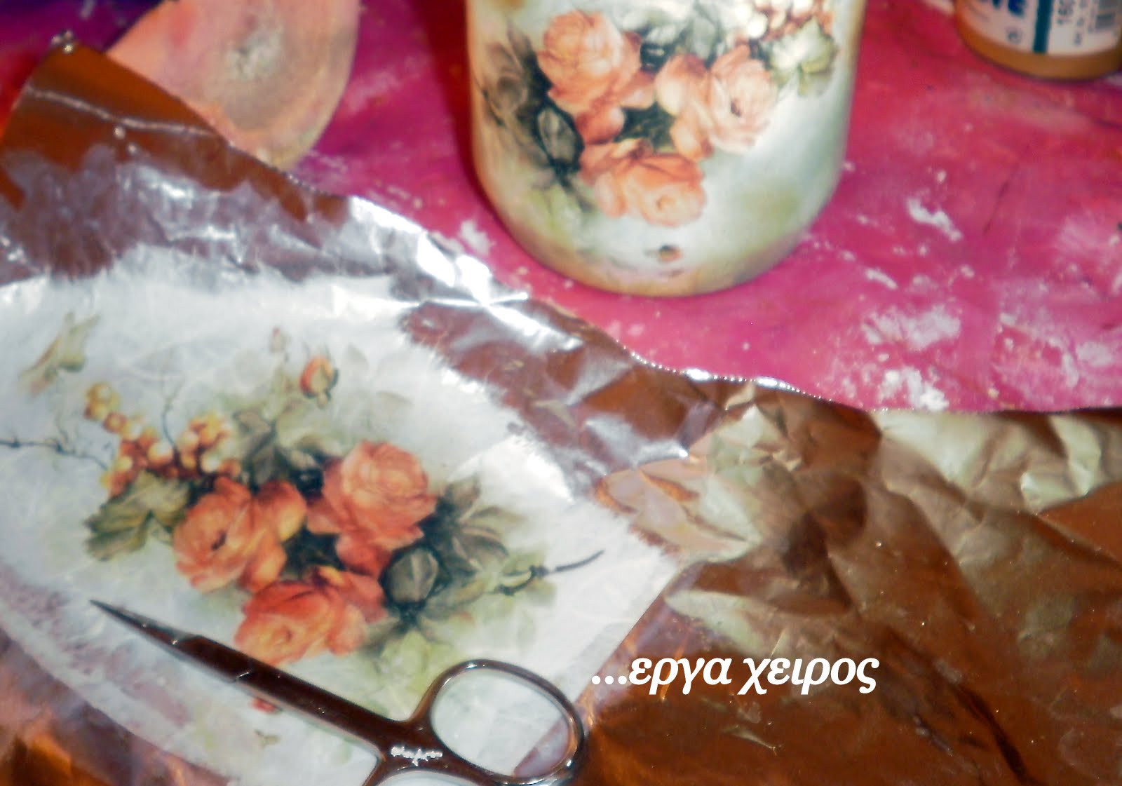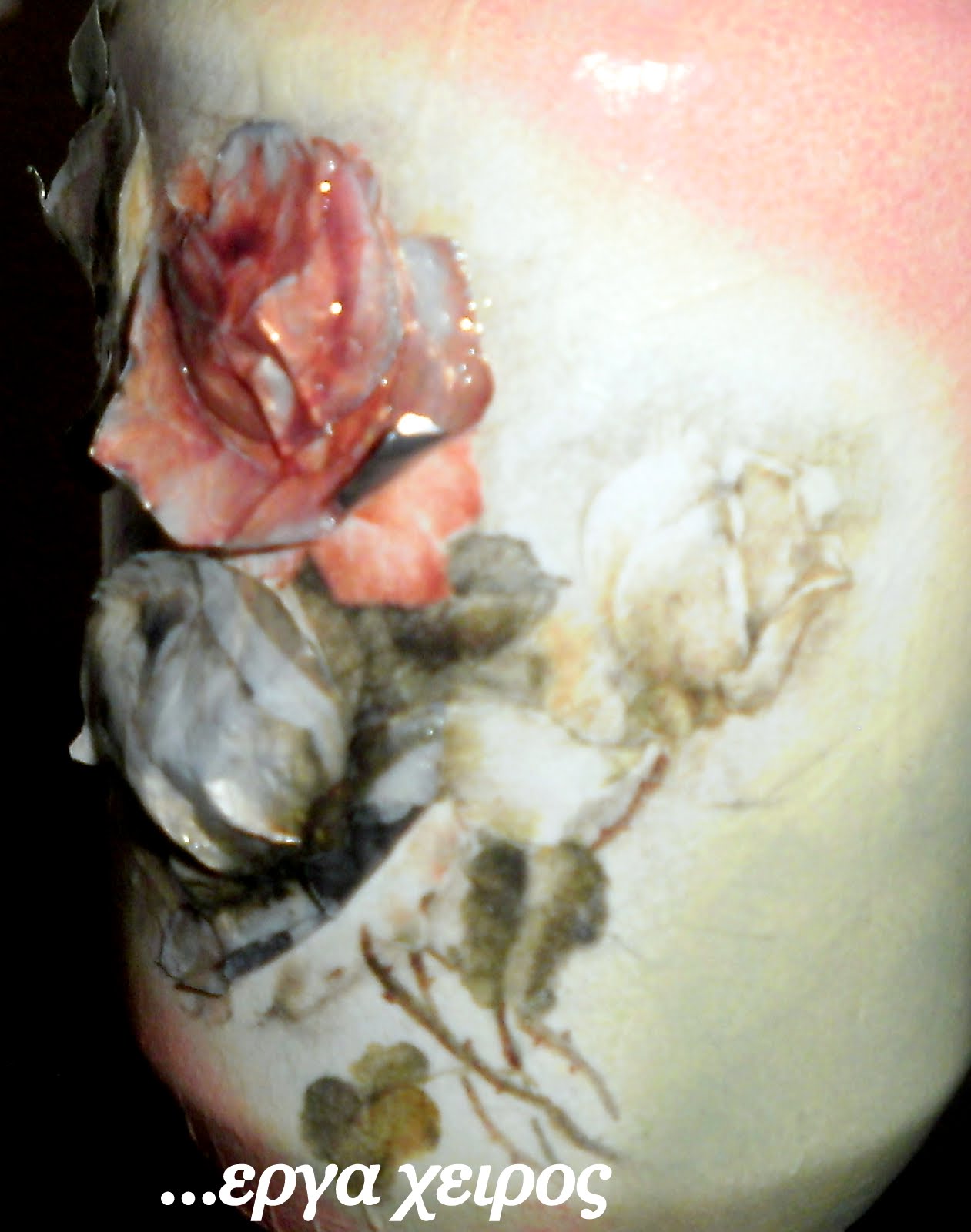 Я сделала то же самое и с рисунком для второго кувшина, а затем я аккуратно начала приклеивать лепестки цветов, начиная с самых нижних .
