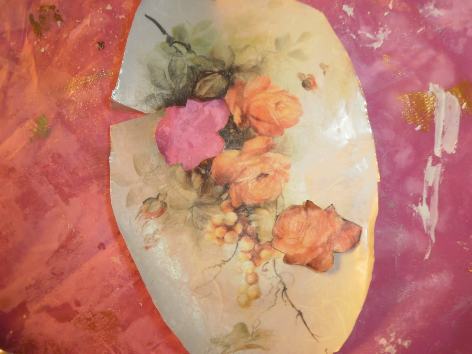 После того, как картинка на фольге полностью высохла, я очень тщательно начала вырезать детали цветов...