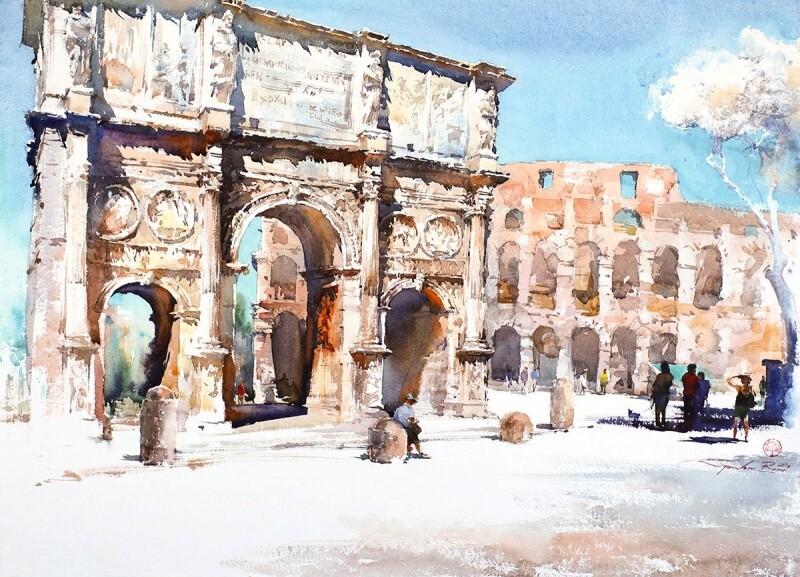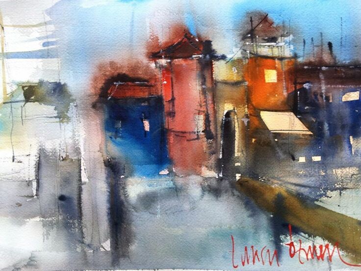 Конек Луиса — быстрые пейзажные наброски: минималистичные скетчи с яркими акварельными акцентами, прекрасно передающие атмосферу далеких городов, их уникальную цветовую гамму.