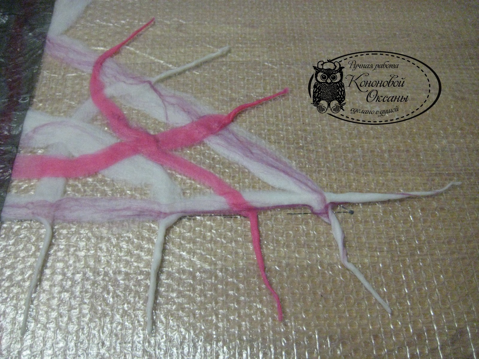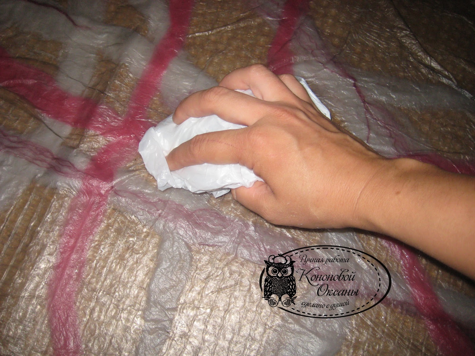 Аккуратно придавливаем шерсть, начиная с центра, чтобы шерсть хорошенько пропиталась мыльным раствором и пузырьки воздуха выгнались. Одновременно с этим происходит первоначальная притирка шерстки. Для этого я использую обыкновенный полиэтиленовый пакет: им и шерсть прижимаю, и притираю. После того, как шерсть прижали, немного этим пакетом погладить без нажима и усилий. Чтобы скользил пакетик хорошо - просто мочим водичкой поверхность пакетов на раскладке.