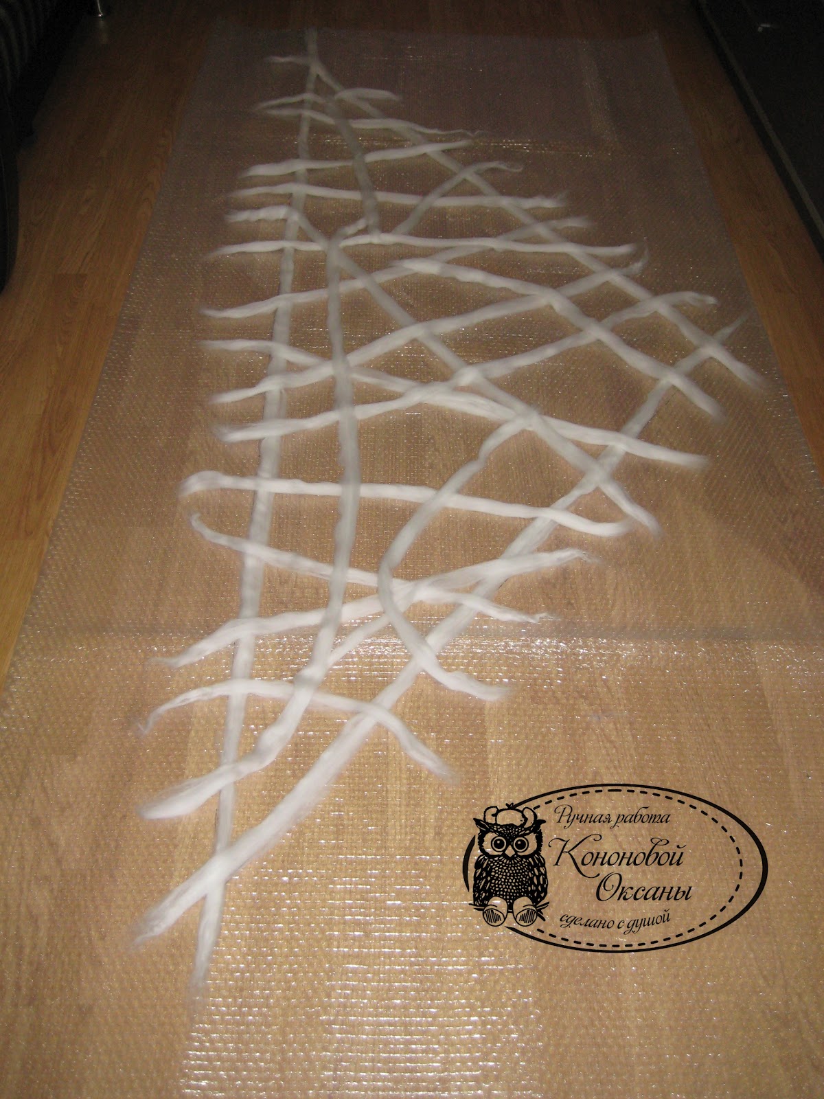 Я валяю на полу, тем более изначально здесь очень длинная раскладка, а не у всех имеется большой стол. На полу разложена пупырка. На стороне, обращенной к полу маркером нарисованы контуры бактуса. В данном случае размеры раскладки по длинной стороне - 220 см, в высоту 80 см. Делим пасму шерсти на ровные прядки и сначала "обводим" контур бактуса основным цветом.