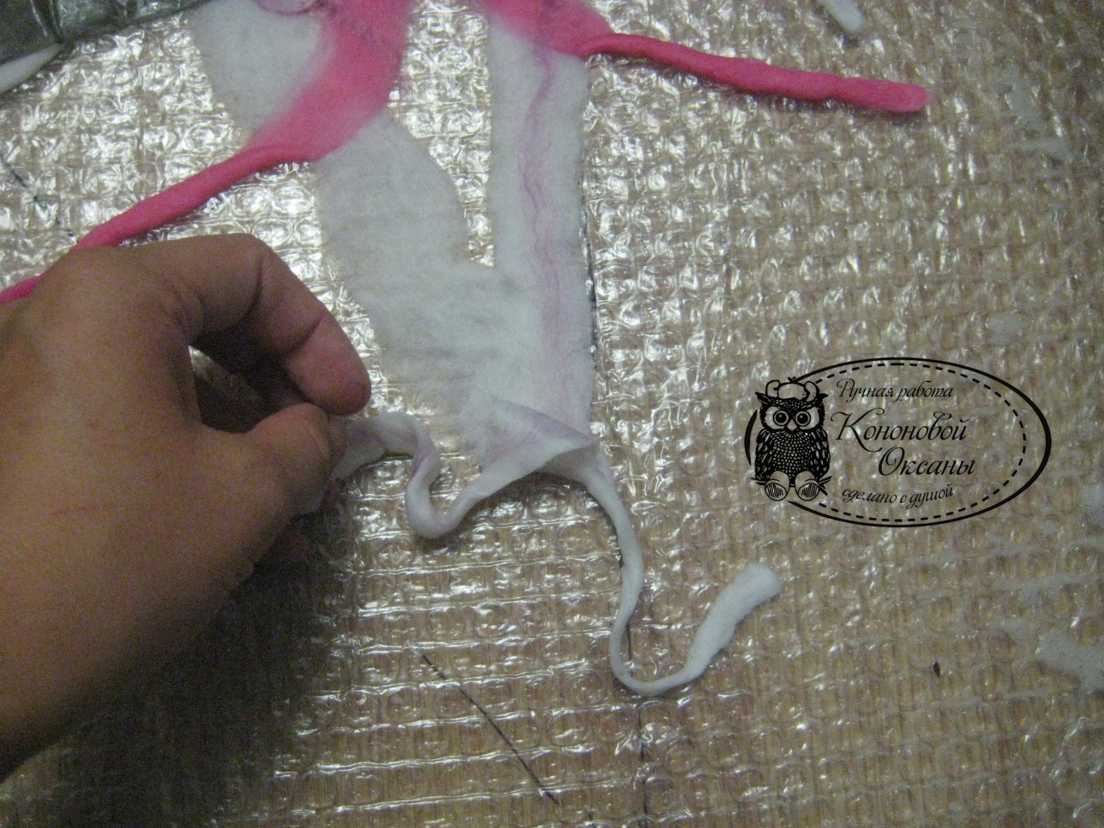 После катания в рулоне, когда волокна шерсти уже достаточно плотно сцепились между собой, начинаем тереть всю поверхность бактуса по пупырке.