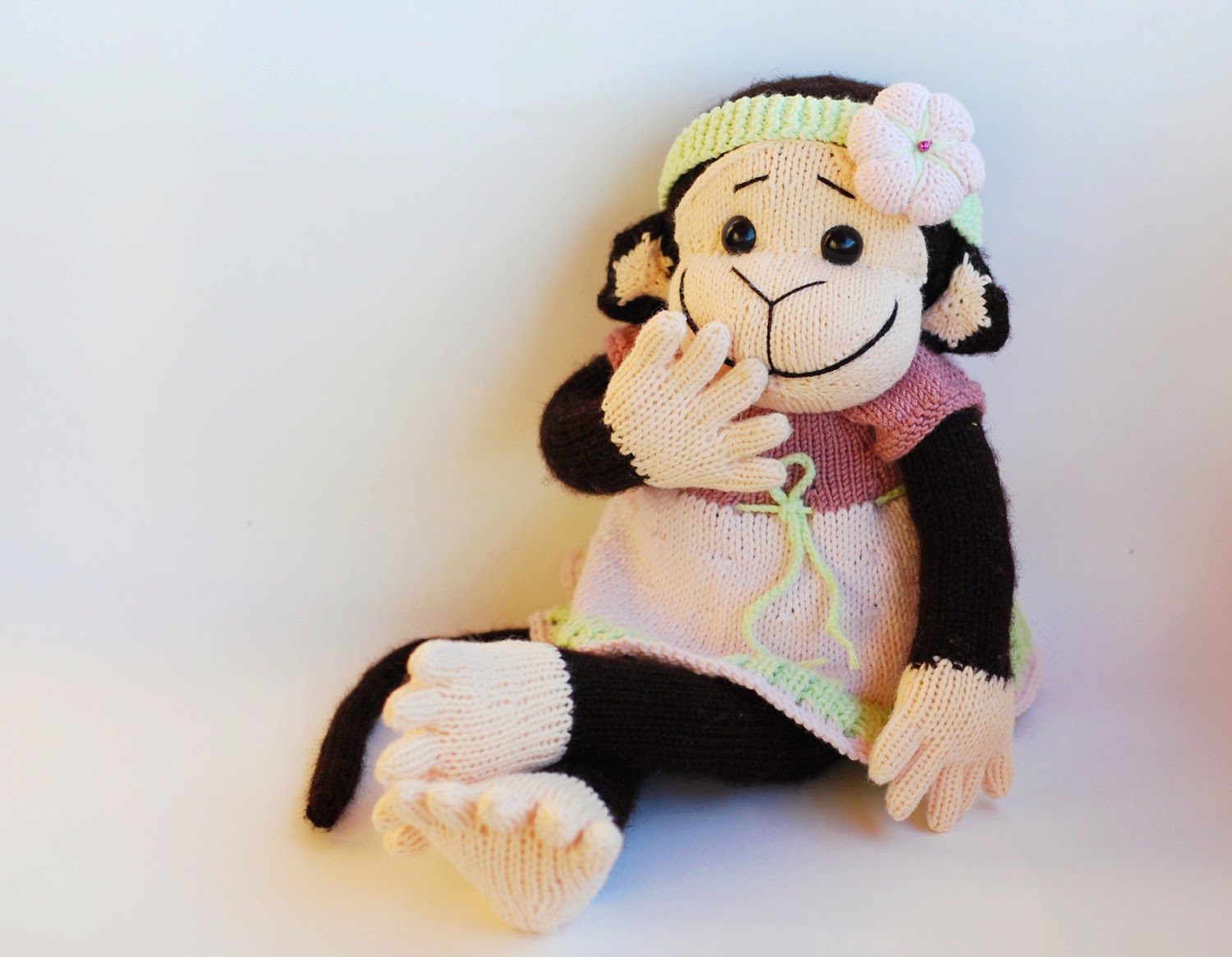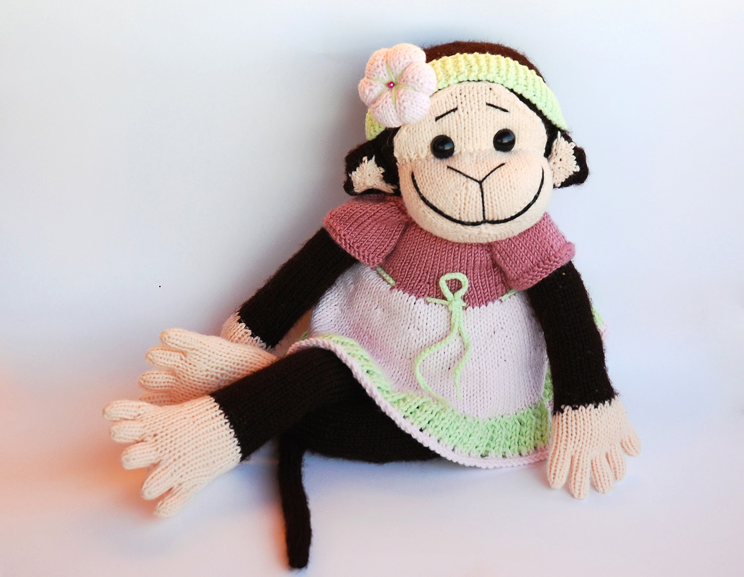 Эту мартышку я связала еще год назад. И она, бедненькая, просидела целый год голышом. И вот, наконец то, я связала ей платьице. 8)))
