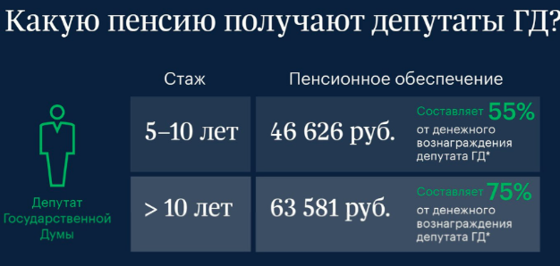 - в случае если депутат отработал от 10 лет и более, то он может рассчитывать на 75% от оклада.