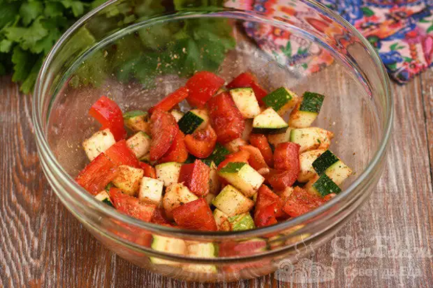 2. Мешочки с курицей и овощами. Блюдо, которое отлично подходит и для праздничного стола. Куриное филе (550 г, у меня филе бедра) нарезаем кусочками, дополняем растительным маслом (1 ст. л.) и любыми специями (у меня сушеный чеснок, паприка, сухая смесь аджика) и перемешиваем.
