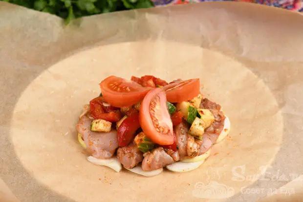 На большой кусок пергамента с силиконовым покрытием выкладываем посередине лук (1/3 часть) и сверху куриное филе (1/3 часть).