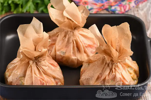 Мешочки перекладываем на тарелку и подаем на стол. Внутри и курица, и овощи получаются очень нежными, сочными и вкусными. Готовить можно из любого мяса и овощей.