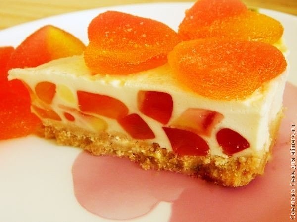 Когда время пришло, поставьте форму с тортом на пол минутки в кипяток и вынимайте. Готовый десерт украсьте оставшемся мармеладом.