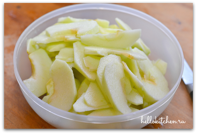 4. А пока займёмся яблоками. Очищаем от кожуры и сердцевины. Нарезаем тонкими дольками. Сбрызгиваем лимонным соком, чтобы яблоки не потемнели.