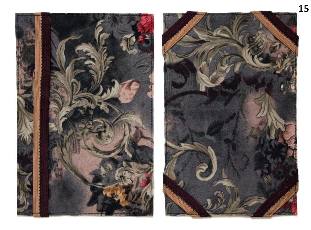 15) Далее хорошо проклеиваем с внутренней стороны, а потом пришиваем резинки-держатели книги и края. Т. к. у меня под рукой не было широкой резинки я соединила две 0,5см. резинки, подходящие по тону к подкладочной ткани, швом зиг-заг с помощью швейной машинки.