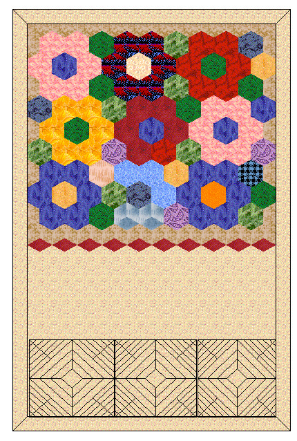 Сначала гексагоны мне жутко не понравились, никакой красоты и гармонии я в них не усмотрела, как их не складывала. Потом сложила традиционный бабушкин сад и сшила в единое полотно. Дальше я занималась другими делами, но полотно далеко не убирала. Потом стала пробовать новую стежку на небольшом кусочке светлой ткани и думать, куда бы теперь эту красоту присобачить, приложила к своему бабушкиному саду, а оно как тут и было. Тогда я быстренько накидала в Electric Quilt 5 проектик и стала собирать топ.
