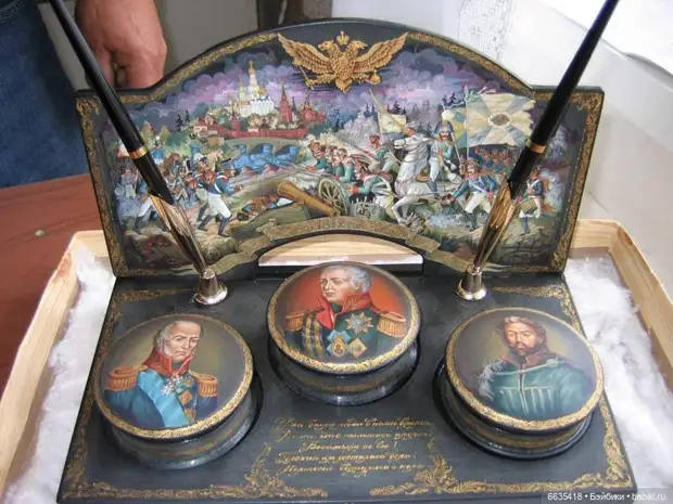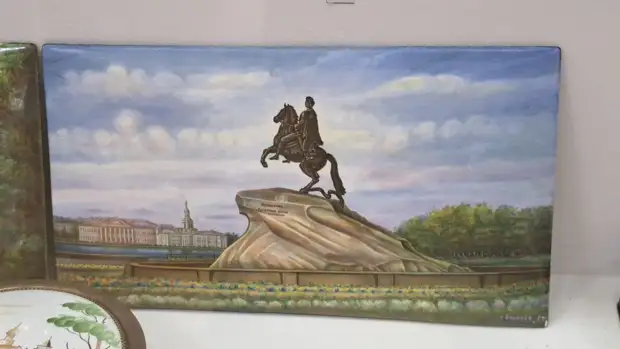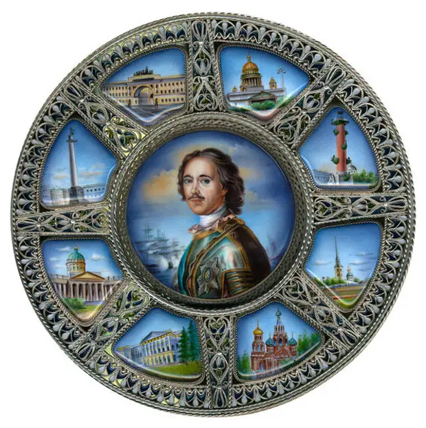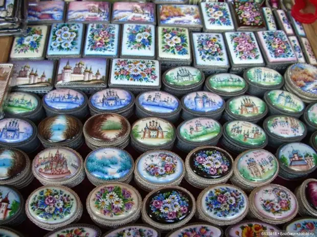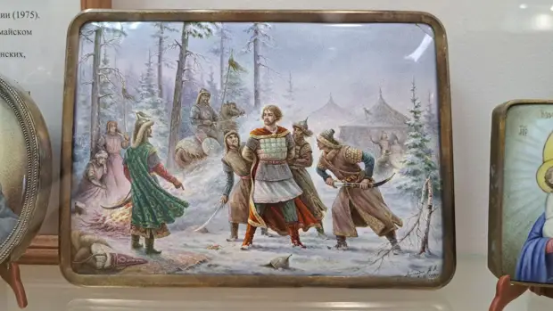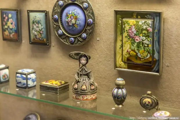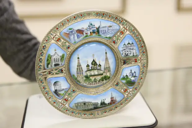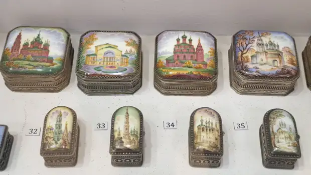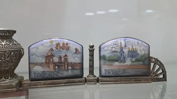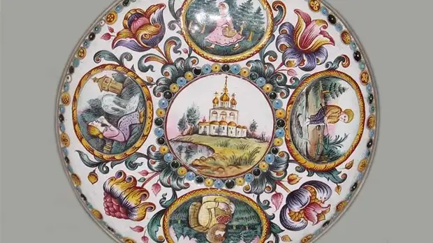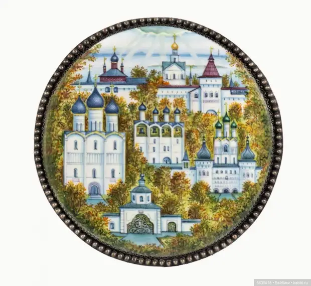 Кроме того, ростовская финифть использовалась для декоративных панно и украшения шкатулок. Поэтому появляется финифть с изображением пейзажей, в первую очередь с видами Ростова Великого и сказочных мотивов.