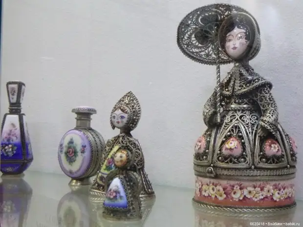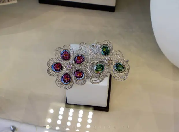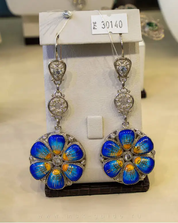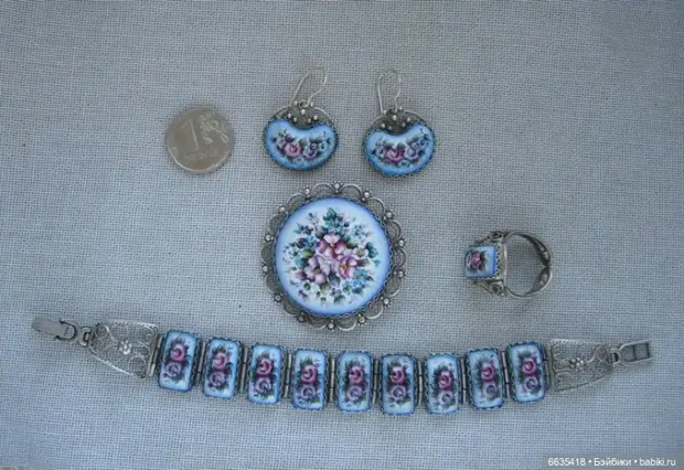 Так сложилось, что ростовская финифть XX века — это не только роспись, но и ювелирная работа. Без неё не обойдутся предметы женского туалета: броши, кольца и серьги, подвески и колье. Для них используется скань — это кружево, узор из серебряной или медной проволоки.