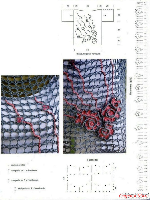 Эта туника связана очень не сложным в исполнении сетчатым узором и украшена аппликацией которая делает ее очень нарядной.