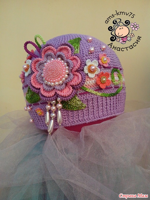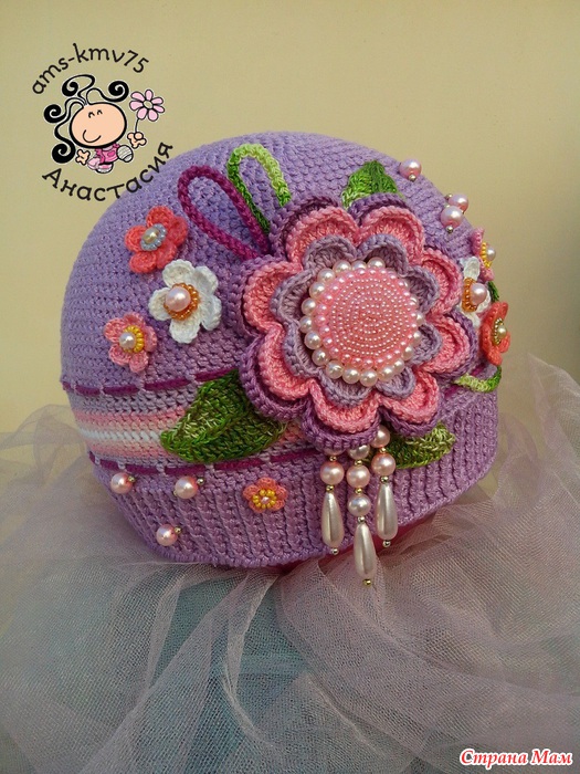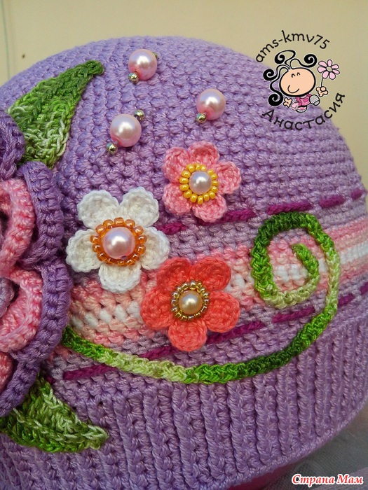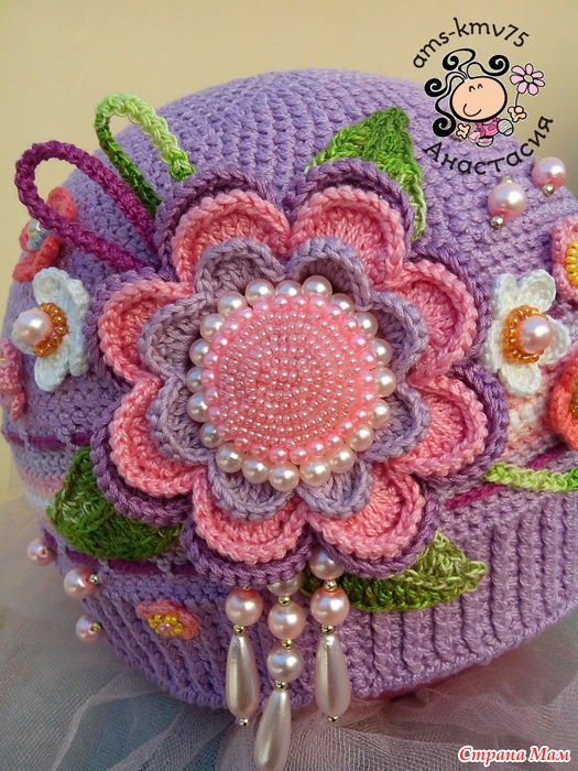 Украшена большим и маленькими разноцветными цветами, зелёными листиками, бусинами и бисером