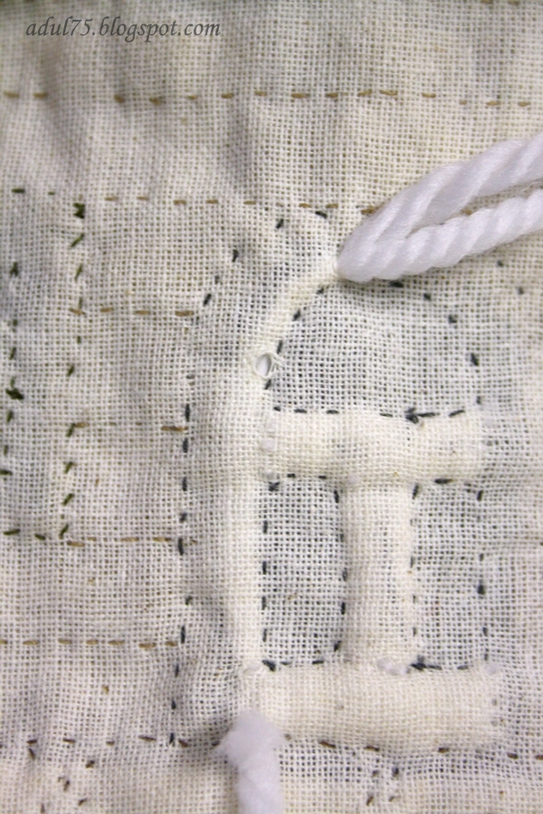 Наша задача уложить шерстяную нить рядами, заполнив пространство между слоев ткани. Начинаем рядом со стежкой.