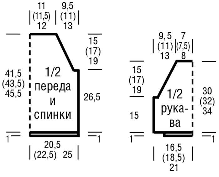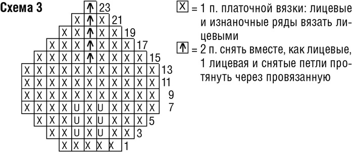 Джемпер из журнала «Verena. Спецвыпуск» № 1/2017 связан спицами. Карманы романтичного джемпера выполнены лицевой гладью и украшены прекрасными вязаными розами. «РОЗА» Вязать по схеме 2. «ЛИСТОЧЕК» Вязать по схеме 3. ![]() ПОДЧЕРКНУТЫЕ УБАВКИ С правого края = после кромочной 2 п. провязать с наклоном влево (= 1 п. снять, как лицевую, 1 лицевая и снятую петлю протянуть через провязанную). С левого края = перед кромочной 2 п. провязать вместе лицевой. ПЛОТНОСТЬ ВЯЗАНИЯ 22 п. х 27 р. = 10 x 10 см, связано сетчатым узором; лицевая гладь – 26 р. = 10 см. ВЫКРОЙКА ВЫПОЛНЕНИЕ РАБОТЫ СПИНКА Набрать на спицы 90 (98) 110 п. и для планки связать 1 см = 2 р. изнаночной гладью и 1 р. лицевой гладью, при этом начать с 1 изнаночного ряда. Далее вязать ажурным сетчатым узором. Для пройм через 26,5 см = 72 р. от конца планки с обеих сторон закрыть 1 x 2 (2) 4 п., затем для скосов реглан с обеих сторон подчеркнуто убавить 19 (22) 25 раз в каждом 2-м р. по 1 п. Для горловины оставшиеся 48 (50) 52 п. через 41,5 см = 112 р. (43,5 см = 118 р.) 45,5 см = 124 р. от конца планки отложить, при этом в последнем изнаночном ряду все петли вязать изнаночными. ПЕРЕД Вязать так же, как спинку. РУКАВА Набрать на спицы для каждого рукава по 42 (46) 52 п. и выполнить планку, как на спинке. В последнем ряду равномерно прибавить 32 (36) 42 п. = 74 (82) 94 п. Далее вязать ажурным сетчатым узором. Через 15 см = 40 р. от конца планки с обеих сторон закрыть 1 x 2 (2) 4 п. и скосы реглан выполнить, как на спинке. Оставшиеся 32 (34) 36 п. через 30 см = 80 р. (32 см = 86 р.) 34 см = 92 р. от конца планки отложить, при этом в последнем изнаночном ряду все петли провязать изнаночными. КАРМАН (2 ДЕТАЛИ) Набрать на спицы для каждого кармана по 25 п. и вязать 10 см = 26 р. лицевой гладью, затем все петли закрыть лицевыми. РОЗА (2 ДЕТАЛИ) Набрать на спицы для каждой розы по 3 п. и вязать по схеме 2. С 1-го по 12-й ряд связать 2 раза, 25–40-й ряды связать 2 раза, затем 57–78-й ряды повторить 3 раза = 122 р. Оставшиеся 3 п. закрыть лицевыми. ЛИСТОЧЕК (4 ДЕТАЛИ) Набрать на спицы для каждого листочка по 5 п. и вязать по схеме 3. Через 23 р. нить отрезать и протянуть через последнюю петлю. СБОРКА Выполнить швы реглан. Отложенные 32 (34) 36 п. левого рукава, 48 (50) 52 п. переда, 32 (34) 36 п. правого рукава и 48 (50) 52 п. спинки перевести на круговые спицы = 160 (168) 176 п. Для планки вязать 2 круг.р. изнаночной гладью, при этом в 1-м круг.р. кромочную провязывать с предыдущей или последующей петлей вместе изнаночной = 152 (160) 168 п. Связать еще 1 круг.р. лицевыми петлями, затем все петли закрыть лицевыми. Выполнить боковые швы и швы рукавов. Розы скрутить, начиная от начального ряда, и закрепить несколькими стежками. Розы пришить посередине карманов. Под ними — вершины направлены по косой вниз – пришить по 2 листочка, выполняя шов только по наборному краю. Для декоративных «шишечек» (2 детали) крючком сделать 1 в.п. и связать в нее 1 «шишечку» (3 в.п. и 3 провязанных вместе ст. с/н), затем выполнить цепочку из 15 в.п. и еще 1 «шишечку». Цепочку из в.п. сложить пополам и пришить под каждой розой, при этом «шишечки» должны свисать в направлении к нижнему краю. Выполнить 2 цепочки из в.п., каждая длиной 10 см. Начало, середину и конец цепочек из в.п. пришить под каждой розой (по верхнему краю) так, чтобы получилось 3 петли. Карманы пришить к переду в одну линию с нижним краем пуловера, при этом в середине между двумя карманами оставить свободными 12 (14) 16 см. [показать] |