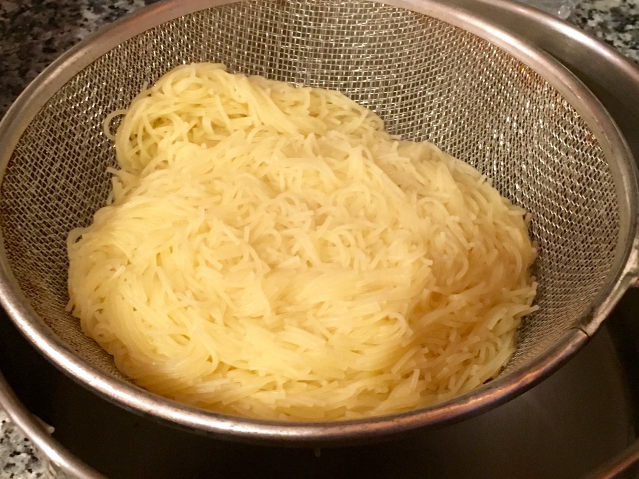 [показать]ленной воды согласно инструкциям на упаковке. Откидываем на дуршлаг и промываем холодной водой.