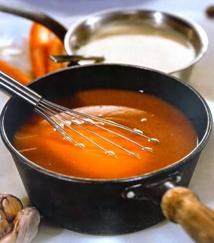 Для того, чтобы соус получился достойным, необходимо правильно сварить и “обработать” бульон. Для варки берём мясо (лучше с костями-потрохами), заливаем его водой, добавляем разные коренья (петрушка, пастернак, лук, морковь, сельдерей), перец, соль и варим на небольшом огне под крышкой несколько часов (от 1,5 до 12). После варки обязательно удаляем из бульона лишний жир, процеживаем бульон и ещё увариваем до нужной густоты.