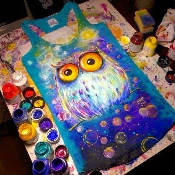 Ее работы меня поразили в самое сердце, заставив искренне восхищаться талантом абсолютно незнакомого мне человека. В числе ее произведений не только открытки, рисунки акварелью, маслом, но и удивительные переделки майки, платьев, обуви и даже головных уборов. Все переделки вещей легко повторить своими руками тем, кто умеет рисовать.