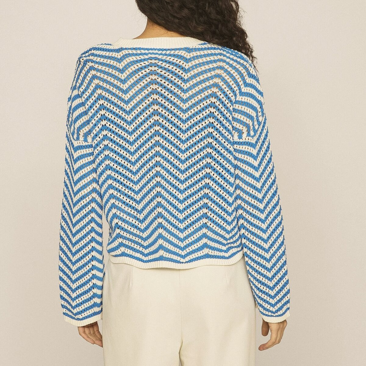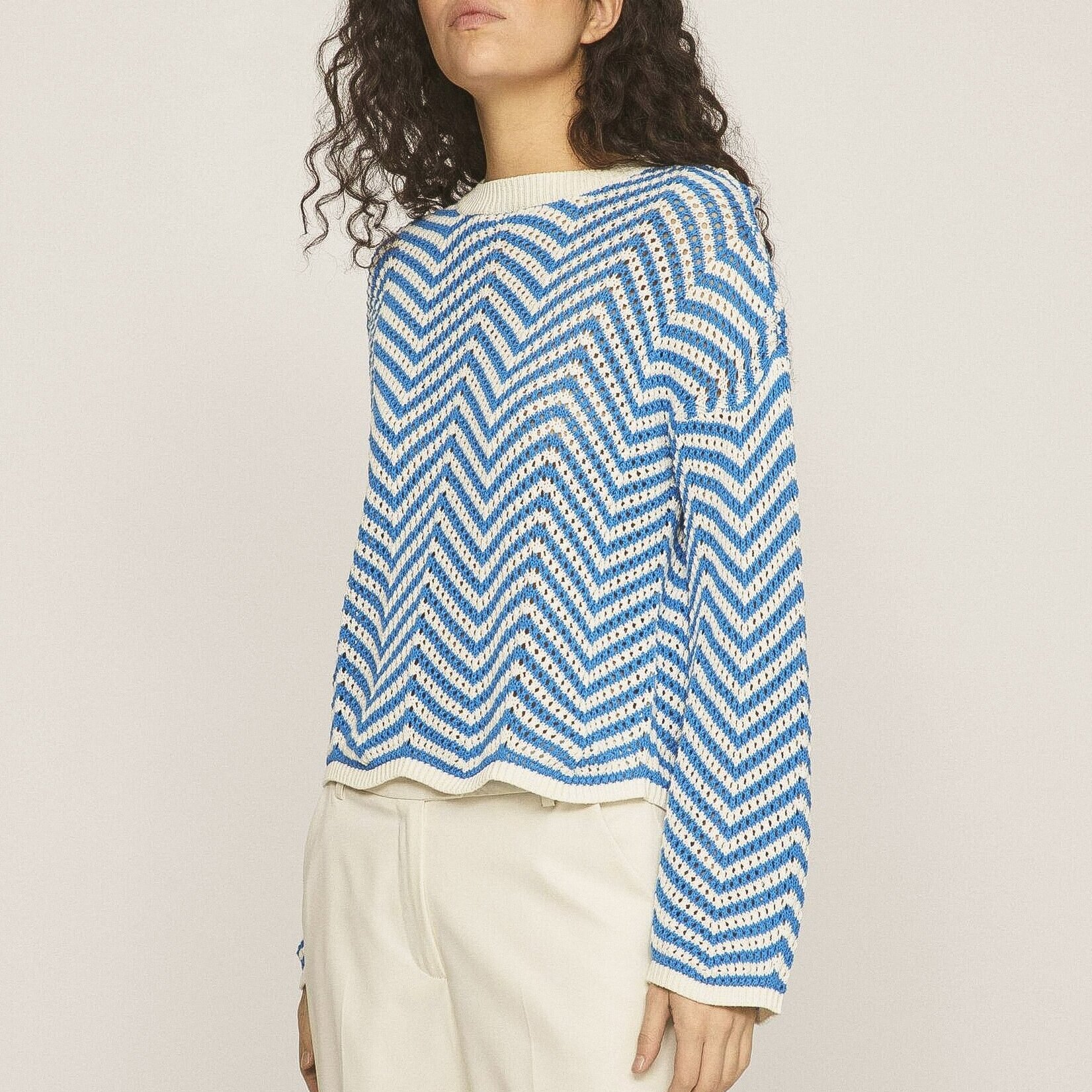 Джемпер в двухцветном исполнении, играющий на контрасте белого и ярко-голубого оттенка пряжи.