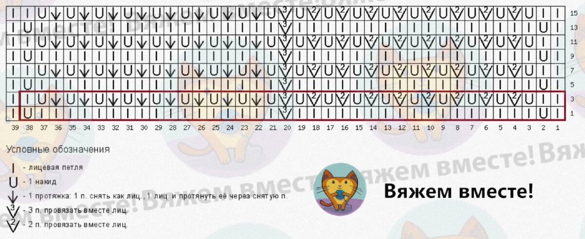 Зигзаги в полотне формируются самостоятельно за счёт структуры ажурного узора. Смена нити происходит через каждые четыре ряда, которые и являются раппортом по высоте.