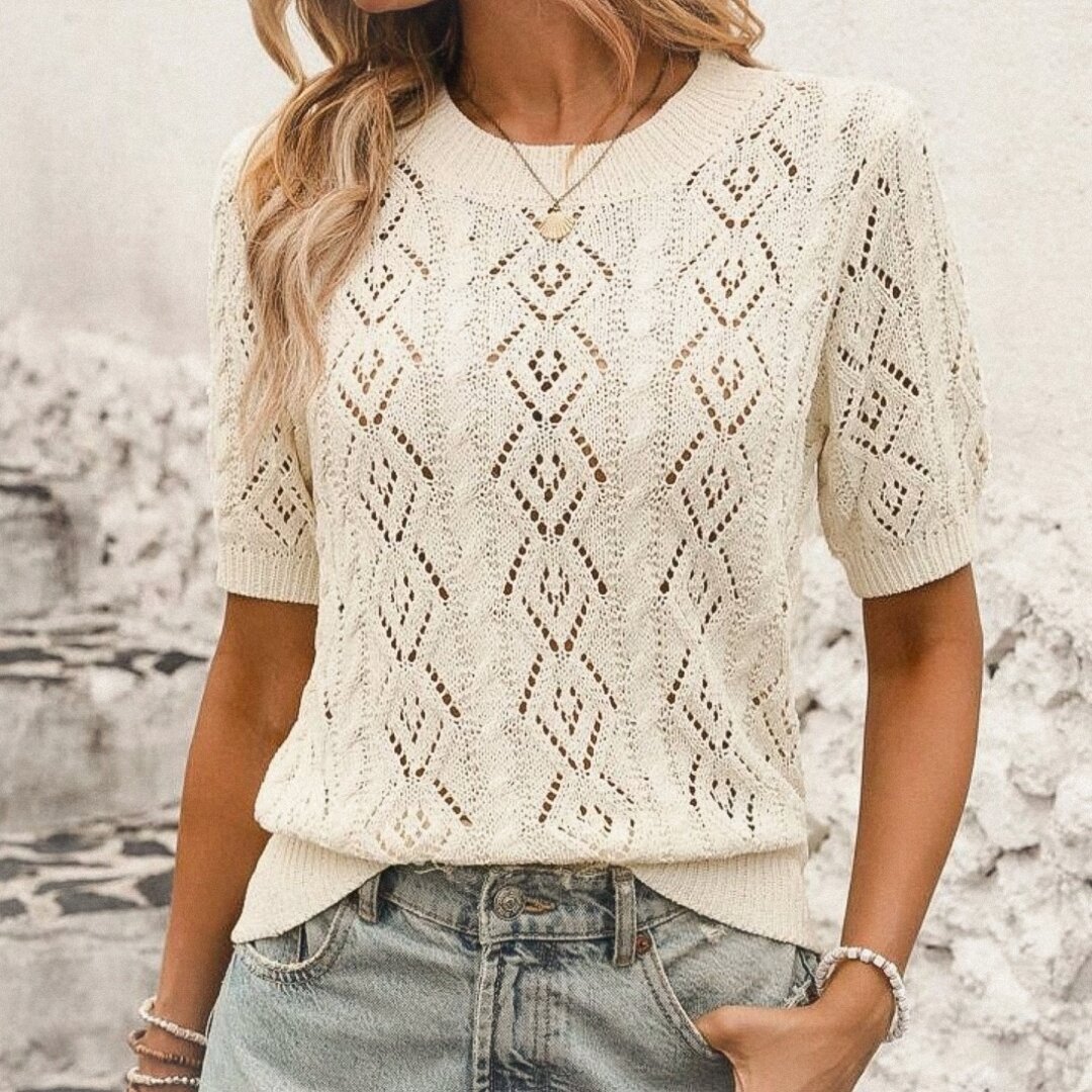 Легкий джемпер с короткими рукавами выполнен интересным ажурным узором в виде ромбов и вертикальными жгутами.