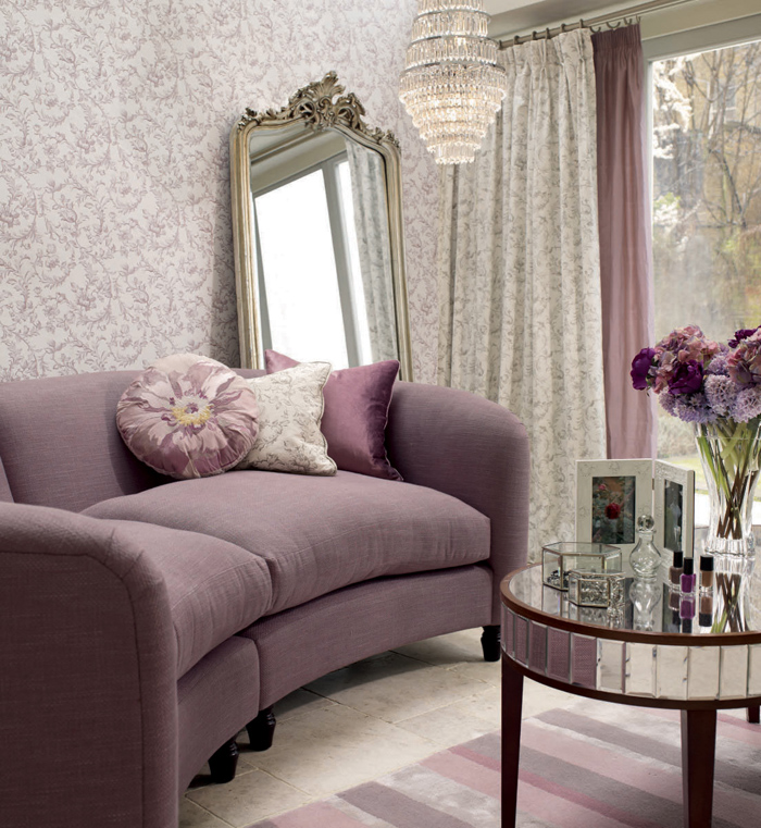 Сиреневая цветовая гамма демонстрирует многогранность дизайна и позволяет создать современный интерьер в гостиной и спальне. Это шикарная палитра оттенков, состоящая из разнообразия декоративных принтов: крупный пион, мелкие разбросанные бутоны и прекрасные растительные узоры с изысканными изгибами. Цветовая гамма представлена оттенками виноградного и аметистового в комбинации с серебристо-серым, желтым и кремовым. Это очень современный интерьер, сочетающийся с цветочным принтом и стильными аксессуарами.