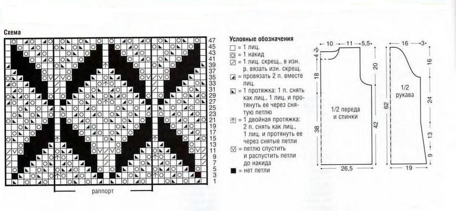 Плотность вязания, основной узор и лиц. гладь: 17 п. и 21 р. = 10 х 10 см.