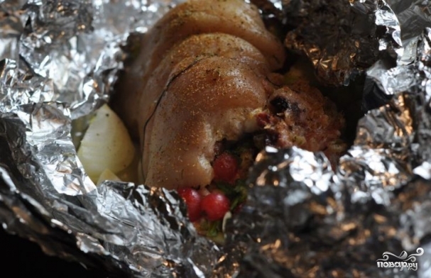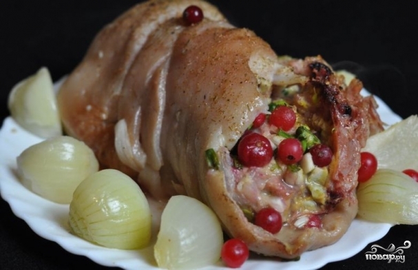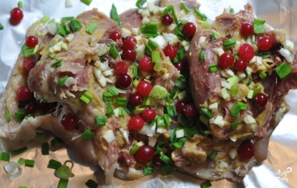 Теперь нам необходимо обмазать рульку изнутри горчицей, посыпать ее молотым перцем и выложить сверху клюкву, нарезанный зеленый лук и измельченный чеснок.