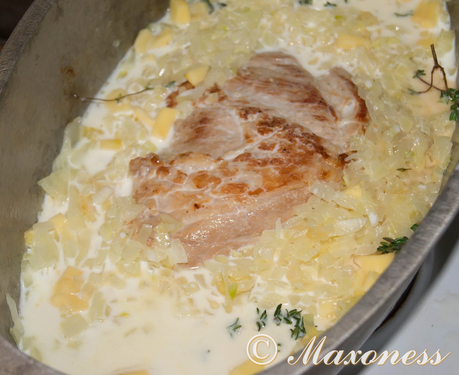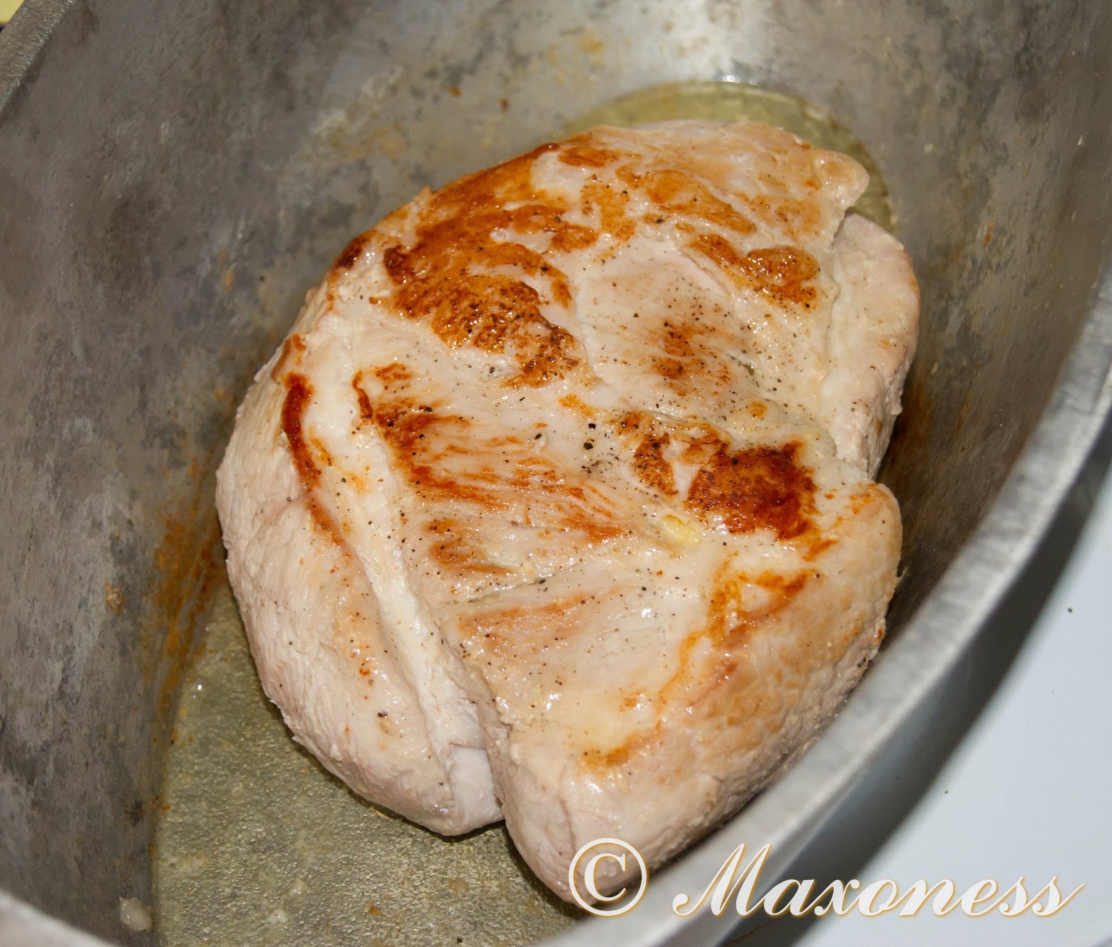 2. Сделать в мясе 6 глубоких надрезов и вставить в каждый по половинке зубчика чеснока. Посыпать солью и перцем. В глубокой кастрюле (я взял утятницу) с толстым дном разогреть 20 грамм сливочного масла и обжарить на нём свинину со всех сторон в течение 15 минут.