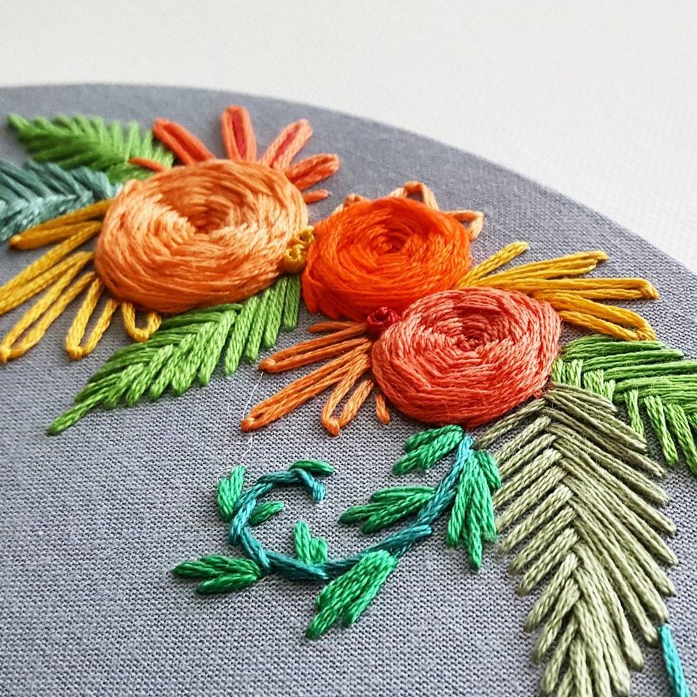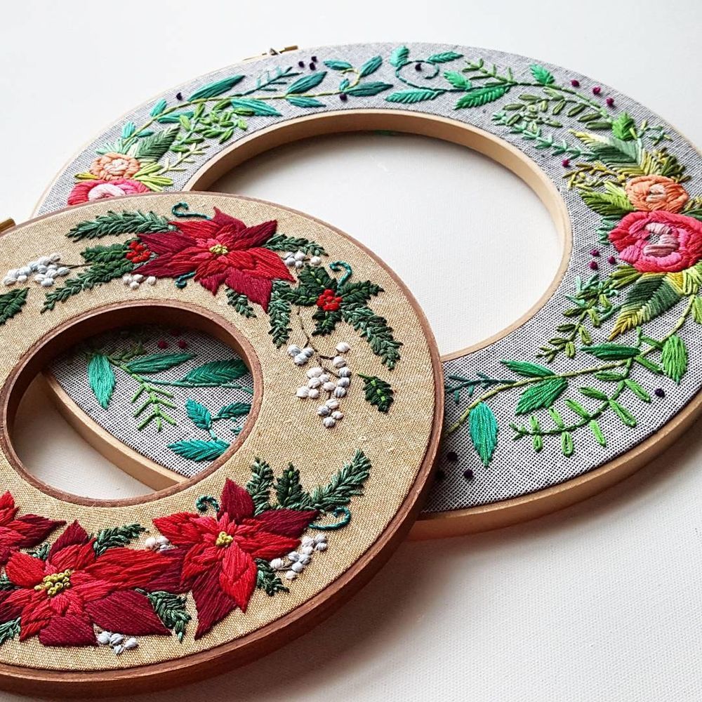Одна из отличительных черт ее творчества — двойные пяльцы. Ткань натягивается сразу на две рамы, выравнивается, и начинается приятный медитативный процесс вышивания гладью и французским узелком. После этого можно закрепить любимое фото во внутреннем кольце. Хотя, такие работы самодостаточны и способны преобразить интерьер своим роскошным, праздничным видом.