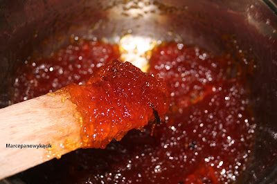Нагреваем, время от времени помешивая. Отставляем остыть. Процесс приготовления и охлаждения повторяем до полного испарения воды. При каждом охлаждении масса становится все гуще. Густую массу надо чаще помешивать, чтобы предотвратить пригорание .