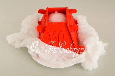 Поверх будущего десерта аккуратно кладем края марли и ставим все