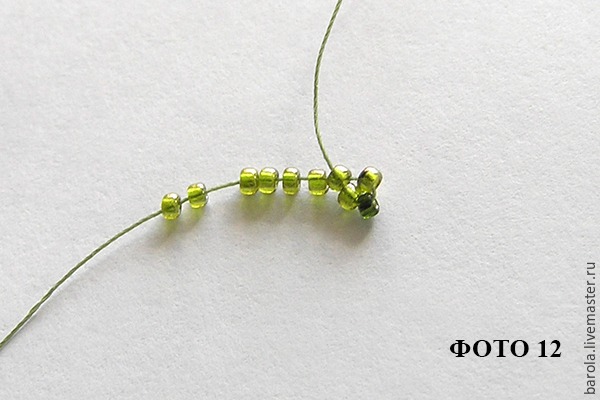Набираем на середину нити 8 зелёных бисерин, 1 бисерину тёмно-зелёную и 1 бисерину зелёную. И проходим в обратном направлении через четвертую с конца бисерину.