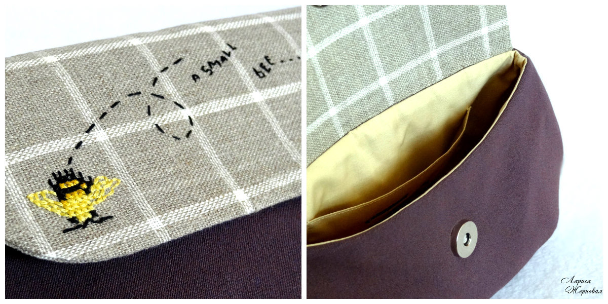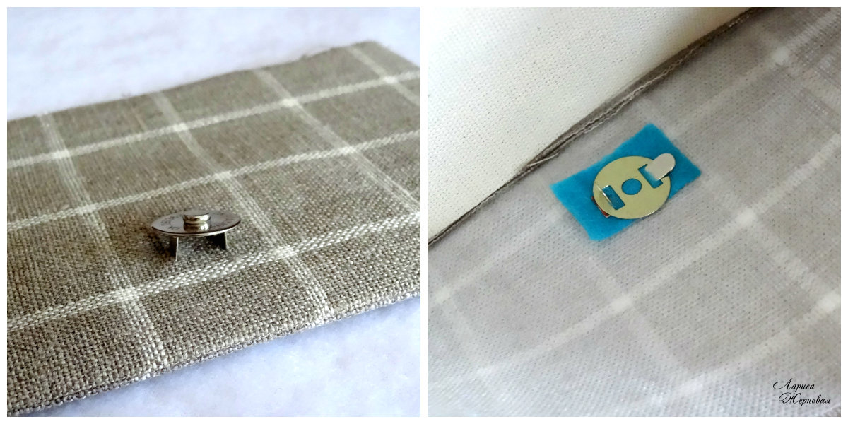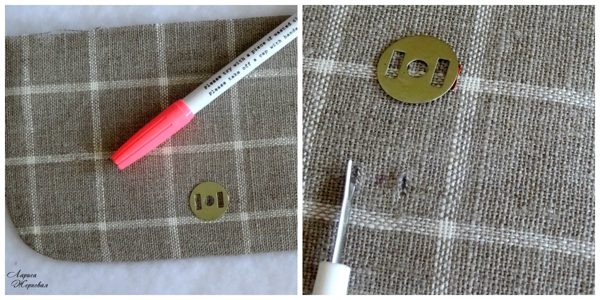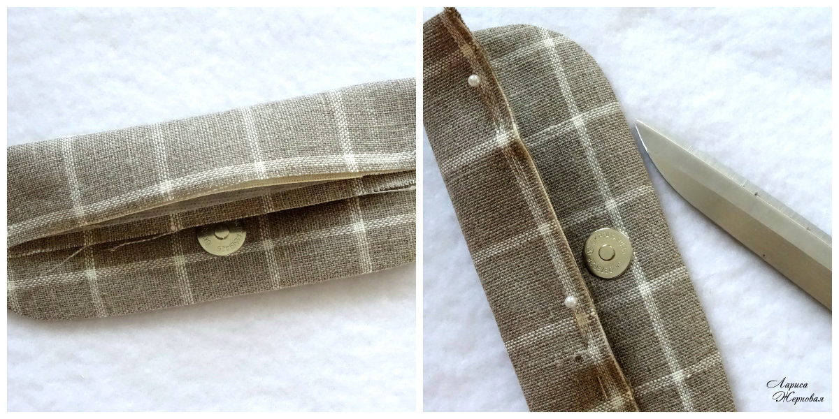 Когда клапан вшит , то можно отметить место на косметичке для второй части застежки и аналогично вставить ее.