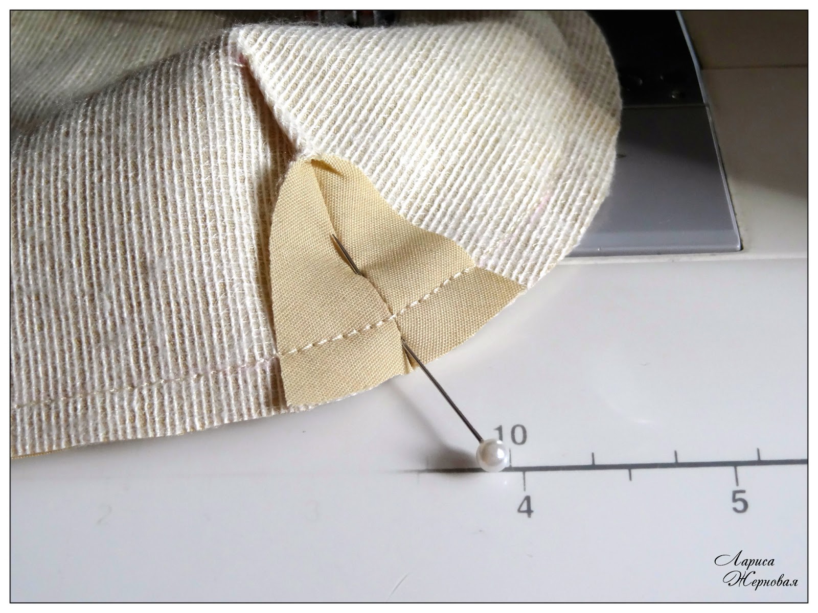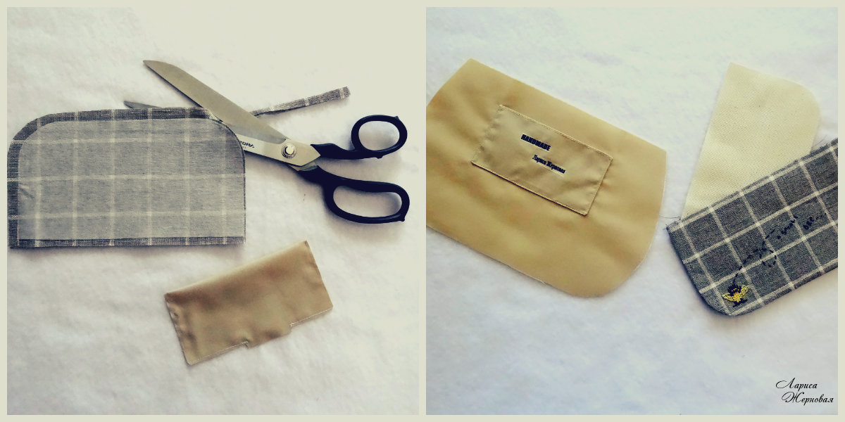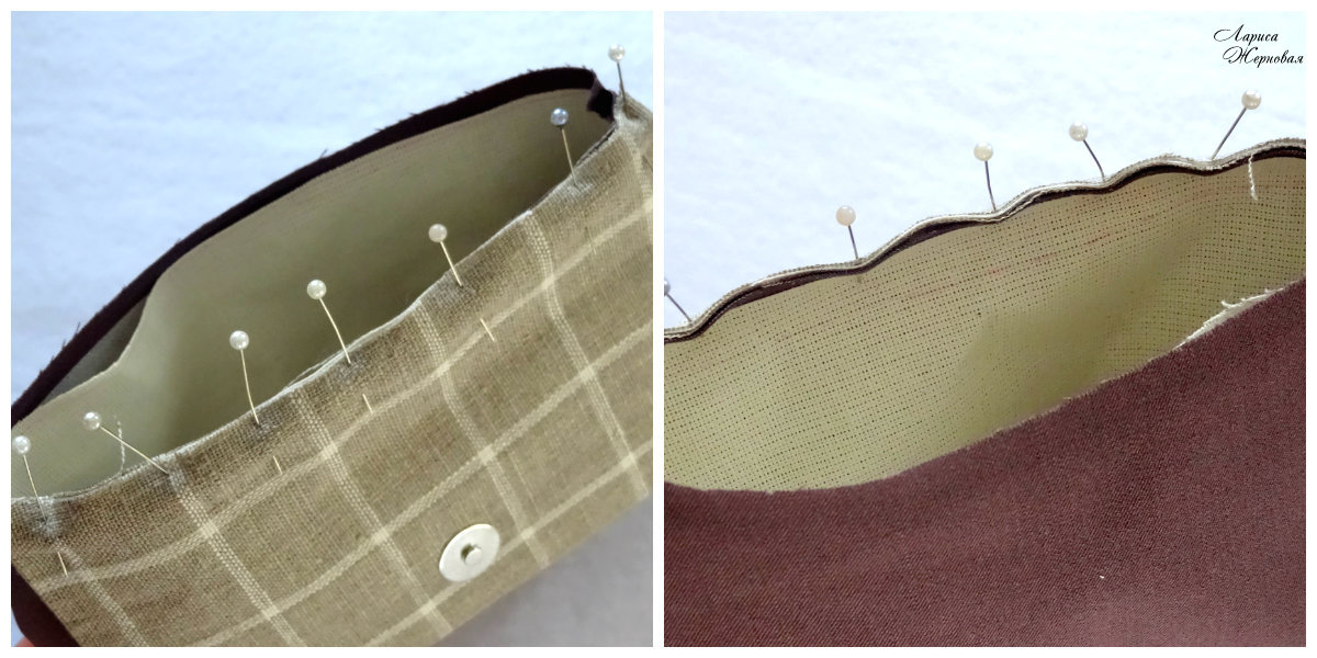 Для того, чтобы клапан "лежал" на косметичке красиво и не топорщился, надо сложить его пополам, как на фото, заколоть излишек и срезать его.