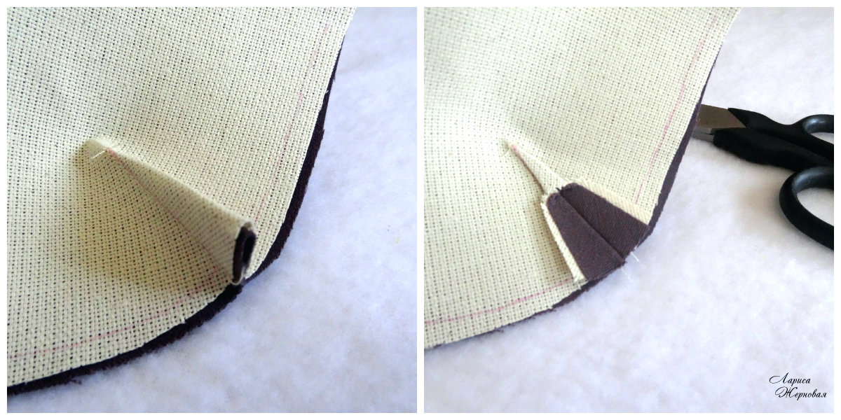 Сшиваем между собой детали косметички, совместив при этом швы вытачек. То же с деталями подкладки, оставив не зашитыми примерно10 см для выворачивания. Срезать припуски до 0,2-0,3 см.