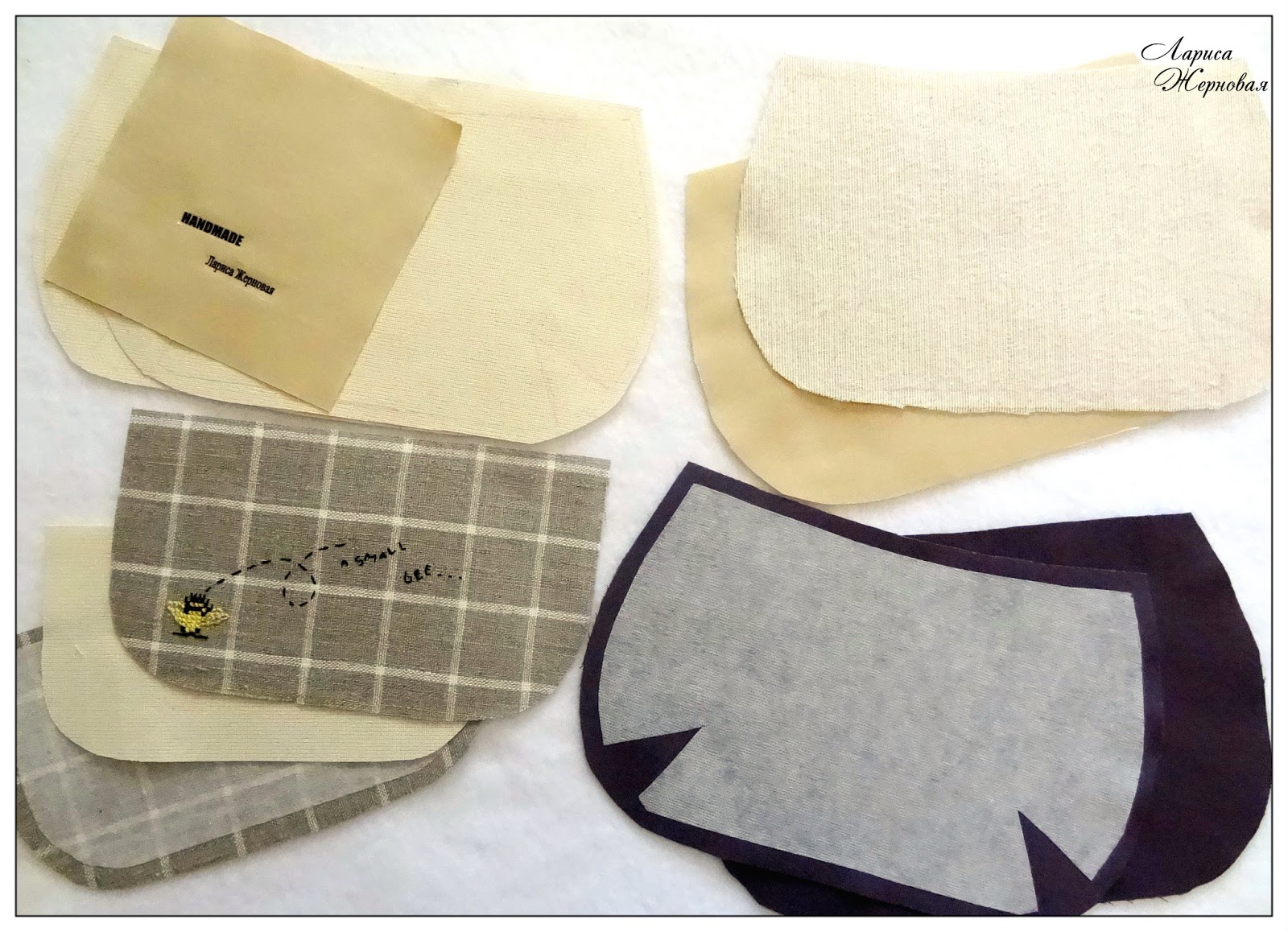 Выкроить из основной ткани: 2 детали клапана, 2 детали косметички ( обратите внимание на выкройку: передняя часть вверху имеет углубление на 1 см); из подкладочной ткани : 2 детали косметички и квадрат 14х14 см для кармана; из двунитки: 1 детали клапана и 2 детали косметички. Все детали из основной ткани укрепить флизелином ( только не на бумажной основе - будет неприятно хрустеть), а подкладку укрепить обычной клеевой.