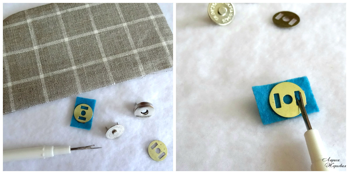 Во внутреннюю деталь клапана вставить часть магнитной застежки - та, которая потоньше: наметить место для проризей на фетре и клапане, разрезать, с лицевой стороны вставить застежку, с внутренней - кусочек фетра, вставить шайбу и разогнуть пластинки в разные стороны. Если не очень понятно написала, то смотрите на фотографию.