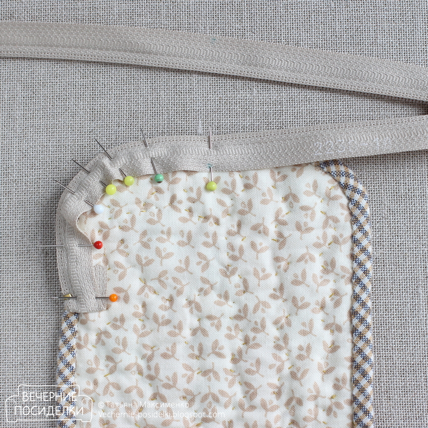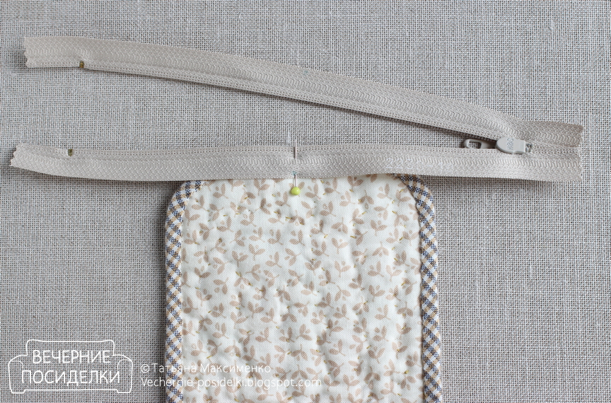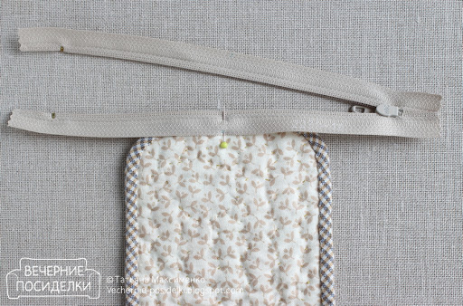 2. На застёжке-молнии отметьте середину. Приколите молнию лицевой стороной к одной из коротких сторон основы со стороны подкладки, совместив метку на молнии с меткой на основе.