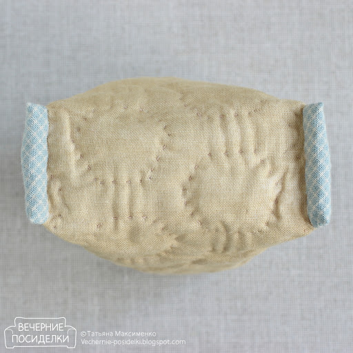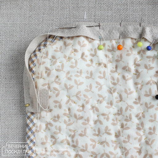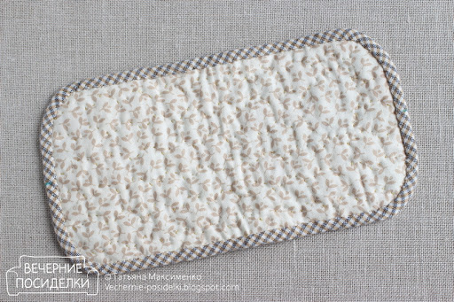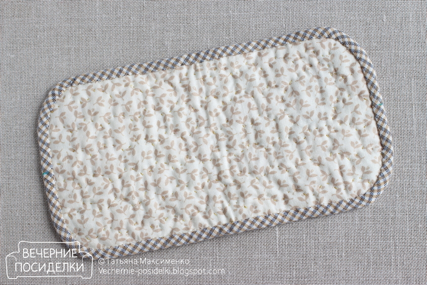 1. Основа косметички — прямоугольник со скруглёнными уголками. В данном примере соотношение сторон основы — один к двум. Основу косметички простегайте и окантуйте косой бейкой. Отметьте середины тех сторон, к которым будет пришиваться застёжка-молния, в данном примере — середины коротких сторон.