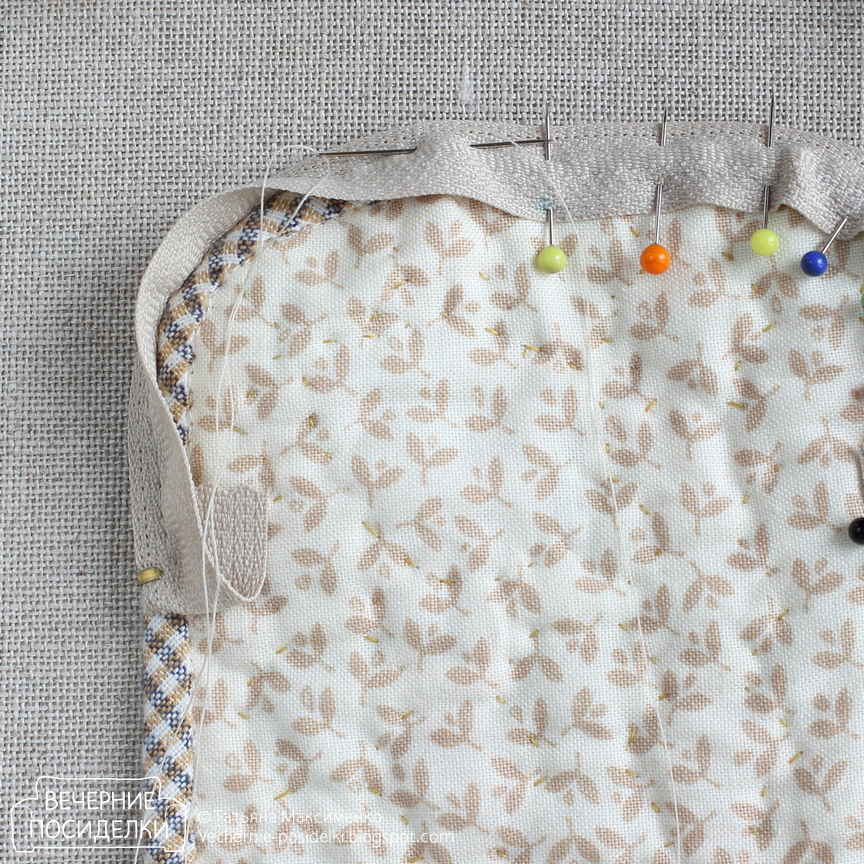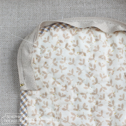 6. Пришейте край тесьмы застёжки-молнии к основе мелкими стежками через край, при этом заправьте подвёрнутые концы тесьмы внутрь.
